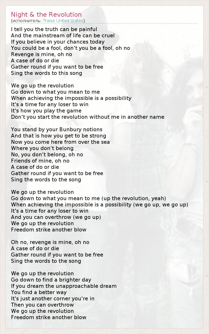 I tell you the truth can be painful And the mainstream of life can be cruel If you believe in your chances today You could be a fool, don't you be a fool, oh no Revenge is mine, oh no A case of do or die Gather round if you want to be free Sing the words to this song We go up the revolution Go down to what you mean to me When achieving the impossible is a possibility It's a time for any loser to win It's how you play the game Don't you start the revolution without me in another name You stand by your Bunbury notions And that is how you get to be strong Now you come here from over the sea Where you don't belong No, you don't belong, oh no Friends of mine, oh no A case of do or die Gather round if you want to be free Sing the words to the song We go up the revolution Go down to what you mean to me (up the revolution, yeah) When achieving the impossible is a possibility (we go up, we go up) It's a time for any loser to win And you can overthrow (we go up) We go up the revolution Freedom strike another blow Oh no, revenge is mine, oh no A case of do or die Gather round if you want to be free Sing the words to the song We go up the revolution Go down to find a brighter day If you dream the unapproachable dream You find a better way It's just another corner you're in Then you can overthrow We go up the revolution Freedom strike another blow