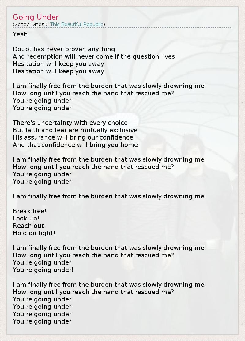 Yeah! Doubt has never proven anything And redemption will never come if the question lives Hesitation will keep you away Hesitation will keep you away I am finally free from the burden that was slowly drowning me How long until you reach the hand that rescued me? You're going under You're going under There's uncertainty with every choice But faith and fear are mutually exclusive His assurance will bring our confidence And that confidence will bring you home I am finally free from the burden that was slowly drowning me How long until you reach the hand that rescued me? You're going under You're going under I am finally free from the burden that was slowly drowning me Break free! Look up! Reach out! Hold on tight! I am finally free from the burden that was slowly drowning me. How long until you reach the hand that rescued me? You're going under You're going under! I am finally free from the burden that was slowly drowning me. How long until you reach the hand that rescued me? You're going under You're going under You're going under You're going under
