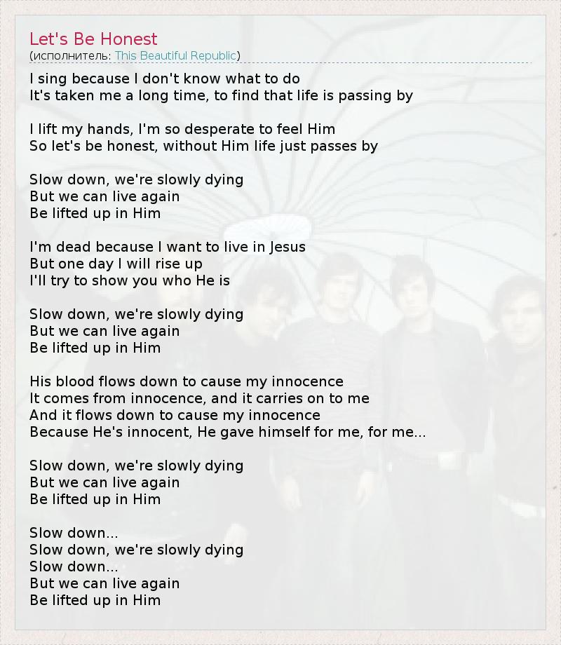 I sing because I don't know what to do It's taken me a long time, to find that life is passing by I lift my hands, I'm so desperate to feel Him So let's be honest, without Him life just passes by Slow down, we're slowly dying But we can live again Be lifted up in Him I'm dead because I want to live in Jesus But one day I will rise up I'll try to show you who He is Slow down, we're slowly dying But we can live again Be lifted up in Him His blood flows down to cause my innocence It comes from innocence, and it carries on to me And it flows down to cause my innocence Because He's innocent, He gave himself for me, for me... Slow down, we're slowly dying But we can live again Be lifted up in Him Slow down... Slow down, we're slowly dying Slow down... But we can live again Be lifted up in Him