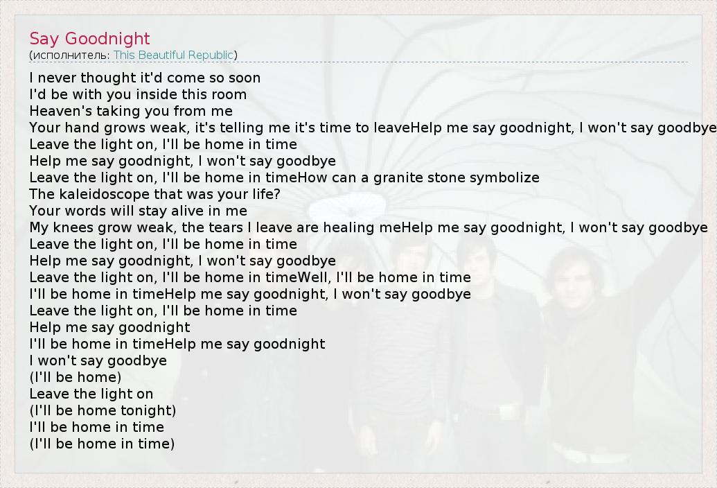 I never thought it'd come so soon I'd be with you inside this room Heaven's taking you from me Your hand grows weak, it's telling me it's time to leaveHelp me say goodnight, I won't say goodbye Leave the light on, I'll be home in time Help me say goodnight, I won't say goodbye Leave the light on, I'll be home in timeHow can a granite stone symbolize The kaleidoscope that was your life? Your words will stay alive in me My knees grow weak, the tears I leave are healing meHelp me say goodnight, I won't say goodbye Leave the light on, I'll be home in time Help me say goodnight, I won't say goodbye Leave the light on, I'll be home in timeWell, I'll be home in time I'll be home in timeHelp me say goodnight, I won't say goodbye Leave the light on, I'll be home in time Help me say goodnight I'll be home in timeHelp me say goodnight I won't say goodbye (I'll be home) Leave the light on (I'll be home tonight) I'll be home in time (I'll be home in time)