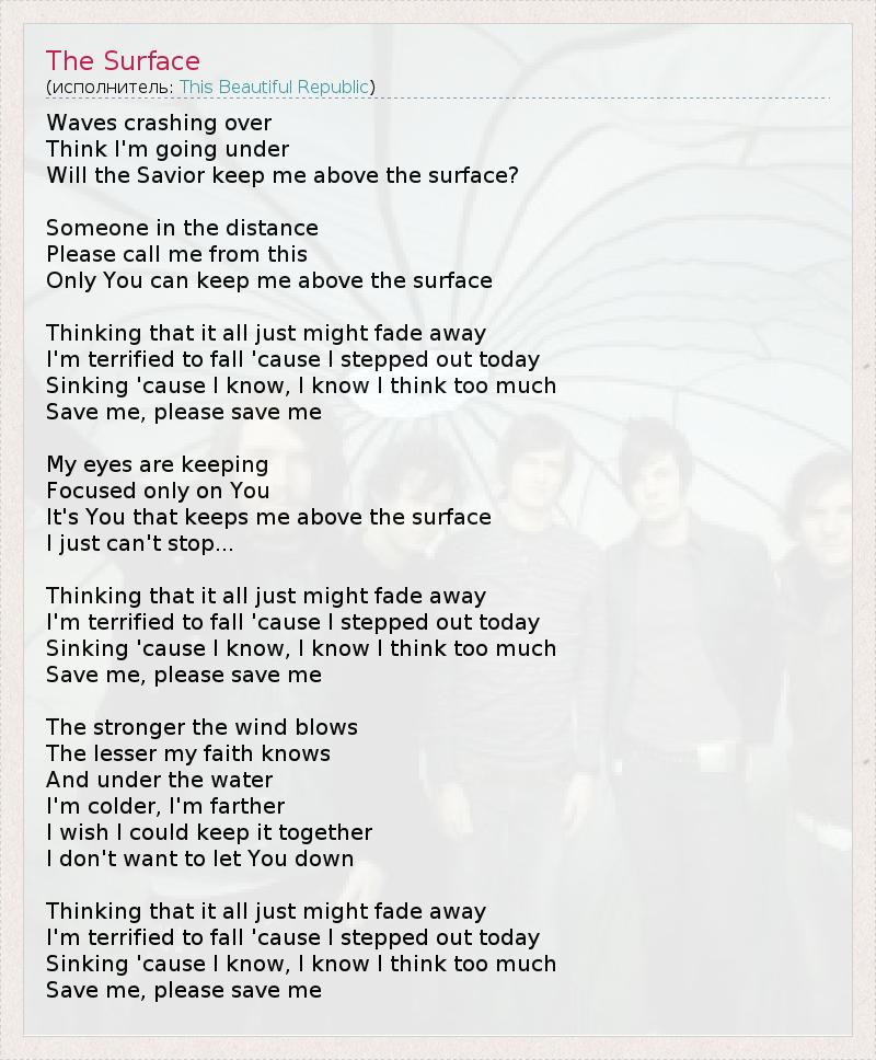 Waves crashing over Think I'm going under Will the Savior keep me above the surface? Someone in the distance Please call me from this Only You can keep me above the surface Thinking that it all just might fade away I'm terrified to fall 'cause I stepped out today Sinking 'cause I know, I know I think too much Save me, please save me My eyes are keeping Focused only on You It's You that keeps me above the surface I just can't stop... Thinking that it all just might fade away I'm terrified to fall 'cause I stepped out today Sinking 'cause I know, I know I think too much Save me, please save me The stronger the wind blows The lesser my faith knows And under the water I'm colder, I'm farther I wish I could keep it together I don't want to let You down Thinking that it all just might fade away I'm terrified to fall 'cause I stepped out today Sinking 'cause I know, I know I think too much Save me, please save me