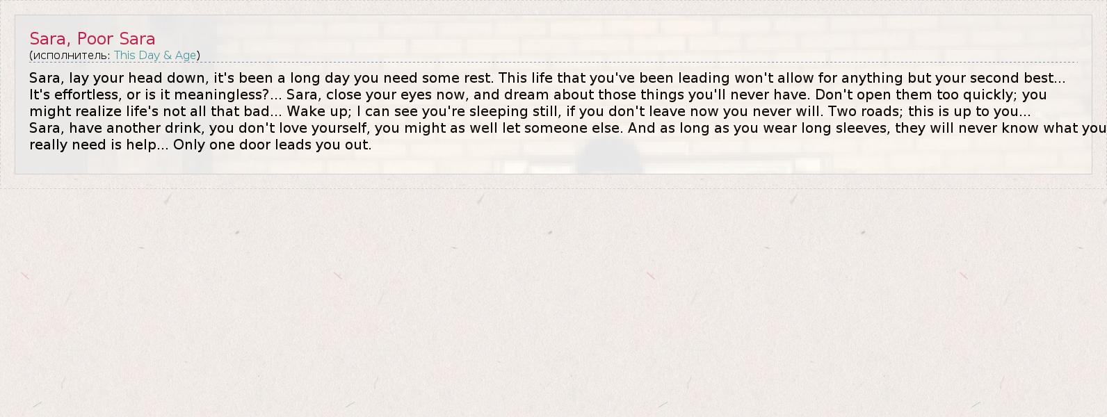 Sara, lay your head down, it's been a long day you need some rest. This life that you've been leading won't allow for anything but your second best...