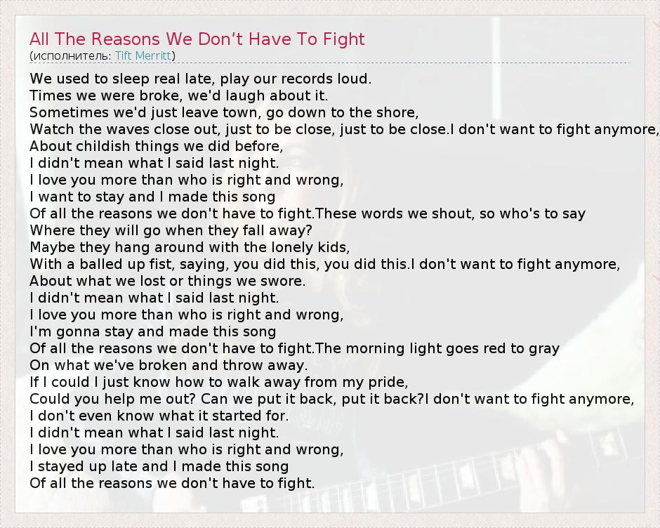 We used to sleep real late, play our records loud. Times we were broke, we'd laugh about it. Sometimes we'd just leave town, go down to the shore, Watch the waves close out, just to be close, just to be close.I don't want to fight anymore, About childish things we did before, I didn't mean what I said last night. I love you more than who is right and wrong, I want to stay and I made this song Of all the reasons we don't have to fight.These words we shout, so who's to say Where they will go when they fall away? Maybe they hang around with the lonely kids, With a balled up fist, saying, you did this, you did this.I don't want to fight anymore, About what we lost or things we swore. I didn't mean what I said last night. I love you more than who is right and wrong, I'm gonna stay and made this song Of all the reasons we don't have to fight.The morning light goes red to gray On what we've broken and throw away. If I could I just know how to walk away from my pride, Could you help me out? Can we put it back, put it back?I don't want to fight anymore, I don't even know what it started for. I didn't mean what I said last night. I love you more than who is right and wrong, I stayed up late and I made this song Of all the reasons we don't have to fight.