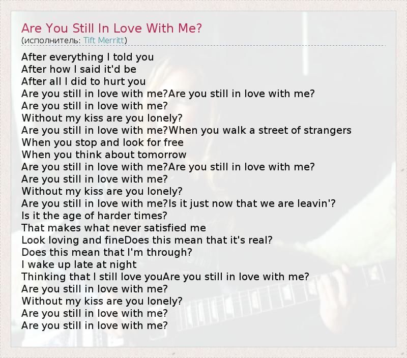 After everything I told you After how I said it'd be After all I did to hurt you Are you still in love with me?Are you still in love with me? Are you still in love with me? Without my kiss are you lonely? Are you still in love with me?When you walk a street of strangers When you stop and look for free When you think about tomorrow Are you still in love with me?Are you still in love with me? Are you still in love with me? Without my kiss are you lonely? Are you still in love with me?Is it just now that we are leavin'? Is it the age of harder times? That makes what never satisfied me Look loving and fineDoes this mean that it's real? Does this mean that I'm through? I wake up late at night Thinking that I still love youAre you still in love with me? Are you still in love with me? Without my kiss are you lonely? Are you still in love with me? Are you still in love with me?