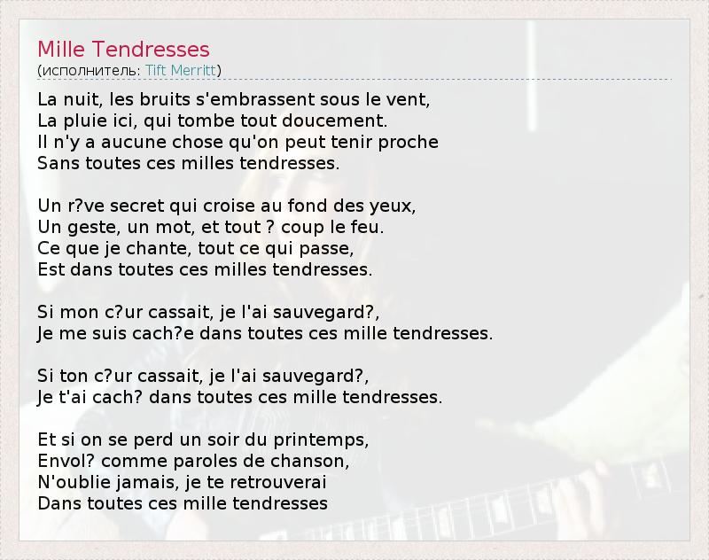La nuit, les bruits s'embrassent sous le vent, La pluie ici, qui tombe tout doucement. Il n'y a aucune chose qu'on peut tenir proche Sans toutes ces milles tendresses. Un r?ve secret qui croise au fond des yeux, Un geste, un mot, et tout ? coup le feu. Ce que je chante, tout ce qui passe, Est dans toutes ces milles tendresses. Si mon c?ur cassait, je l'ai sauvegard?, Je me suis cach?e dans toutes ces mille tendresses. Si ton c?ur cassait, je l'ai sauvegard?, Je t'ai cach? dans toutes ces mille tendresses. Et si on se perd un soir du printemps, Envol? comme paroles de chanson, N'oublie jamais, je te retrouverai Dans toutes ces mille tendresses