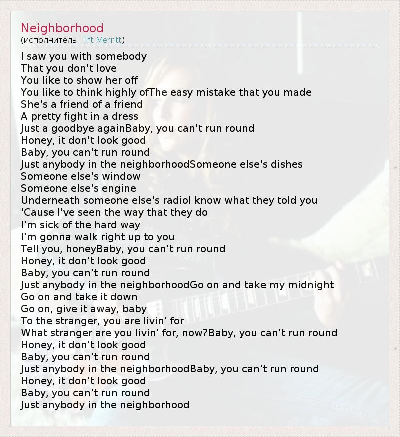 I saw you with somebody That you don't love You like to show her off You like to think highly ofThe easy mistake that you made She's a friend of a friend A pretty fight in a dress Just a goodbye againBaby, you can't run round Honey, it don't look good Baby, you can't run round Just anybody in the neighborhoodSomeone else's dishes Someone else's window Someone else's engine Underneath someone else's radioI know what they told you 'Cause I've seen the way that they do I'm sick of the hard way I'm gonna walk right up to you Tell you, honeyBaby, you can't run round Honey, it don't look good Baby, you can't run round Just anybody in the neighborhoodGo on and take my midnight Go on and take it down Go on, give it away, baby To the stranger, you are livin' for What stranger are you livin' for, now?Baby, you can't run round Honey, it don't look good Baby, you can't run round Just anybody in the neighborhoodBaby, you can't run round Honey, it don't look good Baby, you can't run round Just anybody in the neighborhood
