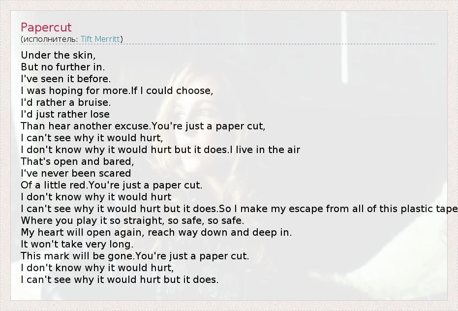 Under the skin, But no further in. I've seen it before. I was hoping for more.If I could choose, I'd rather a bruise. I'd just rather lose Than hear another excuse.You're just a paper cut, I can't see why it would hurt, I don't know why it would hurt but it does.I live in the air That's open and bared, I've never been scared Of a little red.You're just a paper cut. I don't know why it would hurt I can't see why it would hurt but it does.So I make my escape from all of this plastic tape Where you play it so straight, so safe, so safe. My heart will open again, reach way down and deep in. It won't take very long. This mark will be gone.You're just a paper cut. I don't know why it would hurt, I can't see why it would hurt but it does.