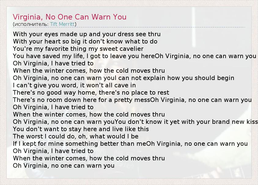 With your eyes made up and your dress see thru With your heart so big it don't know what to do You're my favorite thing my sweet cavelier You have saved my life, I got to leave you hereOh Virginia, no one can warn you Oh Virginia, I have tried to When the winter comes, how the cold moves thru Oh Virginia, no one can warn youI can not explain how you should begin I can't give you word, it won't all cave in There's no good way home, there's no place to rest There's no room down here for a pretty messOh Virginia, no one can warn you Oh Virginia, I have tried to When the winter comes, how the cold moves thru Oh Virginia, no one can warn youYou don't know it yet with your brand new kiss You don't want to stay here and live like this The worst I could do, oh, what would I be If I kept for mine something better than meOh Virginia, no one can warn you Oh Virginia, I have tried to When the winter comes, how the cold moves thru Oh Virginia, no one can warn you