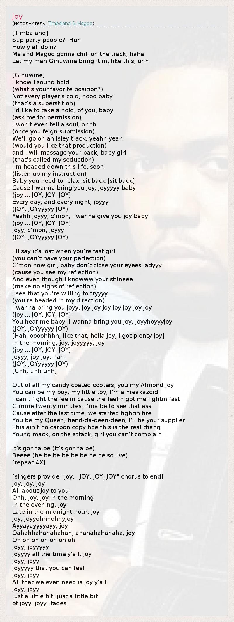 Yeahh joyyy, c'mon, I wanna give you joy baby