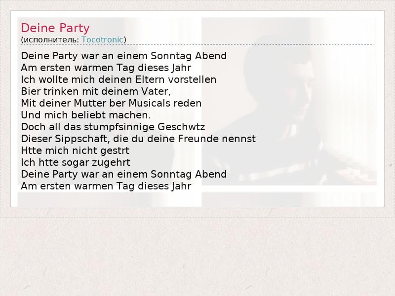 Это интересно:Культовую немецкую рок-группу Tocotronic слушает в Германии не одно поколение «продвинутой» молодежи. О продвижении музыкантов из Гамбурга к их нынешней славе DW-WORLD.DE рассказал вокалист Дирк фон Ловцов.Противники победы «чистого разума» — инди-рокеры из ГамбургаГамбург, 1993: Ян Мюллер (Jan Müller) (бас-гитара) и Арне Занк (Arne Zank) (ударные), оба из гамбургских панк-групп Punkarsch и Meine Eltern, основывают... продолжение