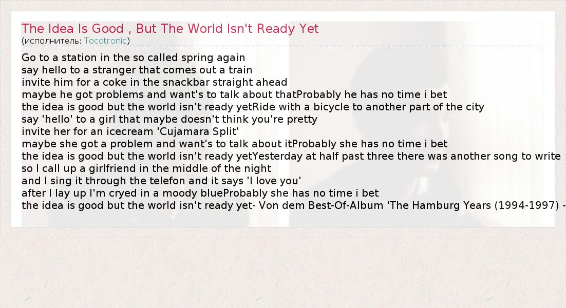 ГлавнаяИсполнителиTocotronicThe Idea Is Good , But The World Isn't Ready Yet