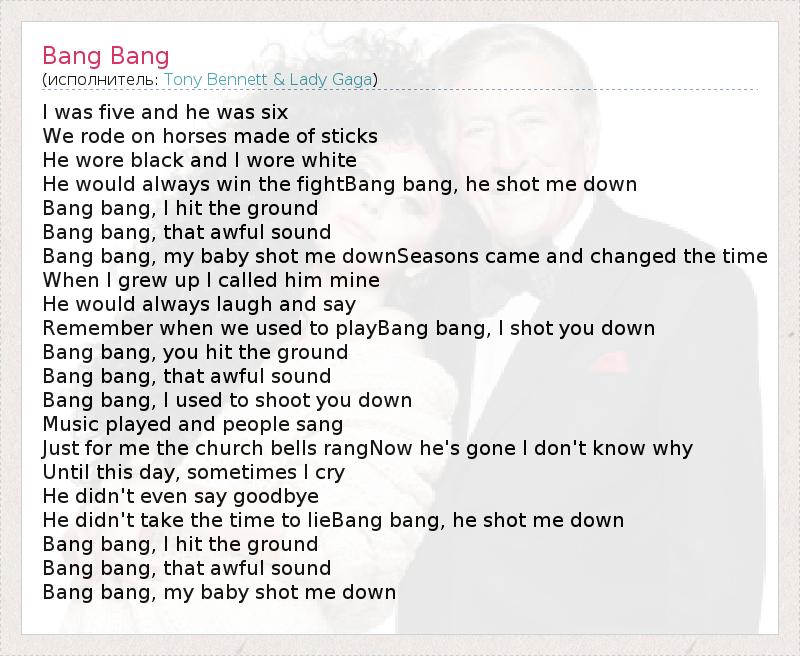 I was five and he was six We rode on horses made of sticks He wore black and I wore white He would always win the fightBang bang, he shot me down Bang bang, I hit the ground Bang bang, that awful sound Bang bang, my baby shot me downSeasons came and changed the time When I grew up I called him mine He would always laugh and say Remember when we used to playBang bang, I shot you down Bang bang, you hit the ground Bang bang, that awful sound Bang bang, I used to shoot you down Music played and people sang Just for me the church bells rangNow he's gone I don't know why Until this day, sometimes I cry He didn't even say goodbye He didn't take the time to lieBang bang, he shot me down Bang bang, I hit the ground Bang bang, that awful sound Bang bang, my baby shot me down