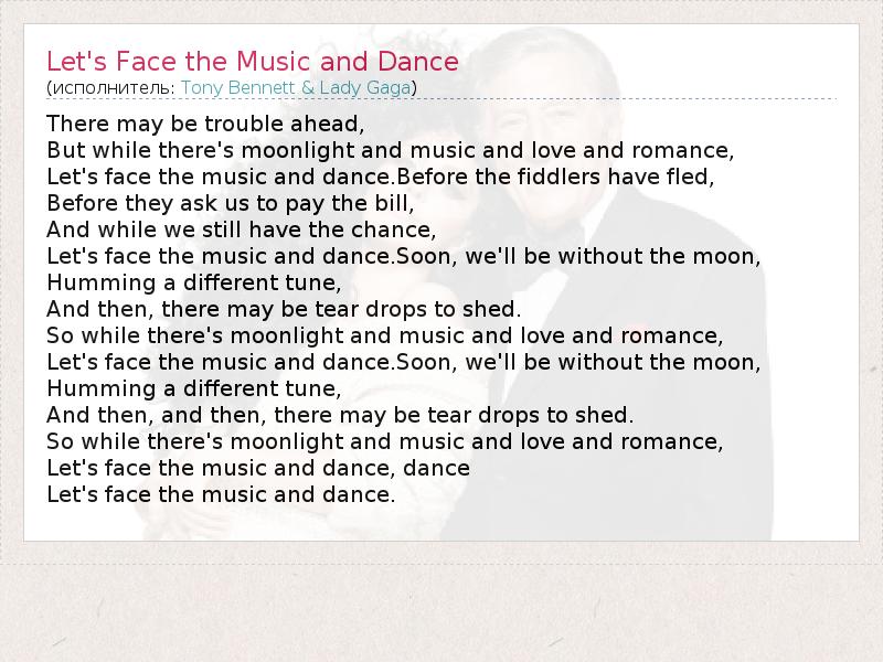 А как ты думаешь, о чем песня "Let's Face the Music and Dance" ?