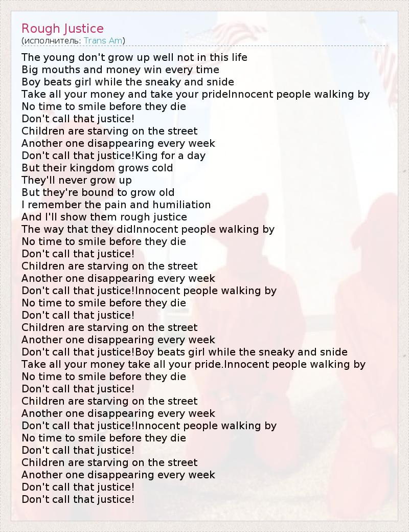 The young don't grow up well not in this life Big mouths and money win every time Boy beats girl while the sneaky and snide Take all your money and take your prideInnocent people walking by No time to smile before they die Don't call that justice! Children are starving on the street Another one disappearing every week Don't call that justice!King for a day But their kingdom grows cold They'll never grow up But they're bound to grow old I remember the pain and humiliation And I'll show them rough justice The way that they didInnocent people walking by No time to smile before they die Don't call that justice! Children are starving on the street Another one disappearing every week Don't call that justice!Innocent people walking by No time to smile before they die Don't call that justice! Children are starving on the street Another one disappearing every week Don't call that justice!Boy beats girl while the sneaky and snide Take all your money take all your pride.Innocent people walking by No time to smile before they die Don't call that justice! Children are starving on the street Another one disappearing every week Don't call that justice!Innocent people walking by No time to smile before they die Don't call that justice! Children are starving on the street Another one disappearing every week Don't call that justice! Don't call that justice!