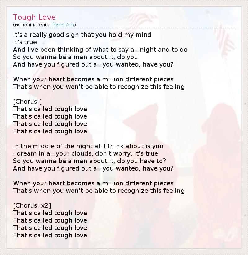 It's a really good sign that you hold my mind It's true And I've been thinking of what to say all night and to do So you wanna be a man about it, do you And have you figured out all you wanted, have you? When your heart becomes a million different pieces That's when you won't be able to recognize this feeling [Chorus:] That's called tough love That's called tough love That's called tough love That's called tough love In the middle of the night all I think about is you I dream in all your clouds, don't worry, it's true So you wanna be a man about it, do you have to? And have you figured out all you wanted, have you? When your heart becomes a million different pieces That's when you won't be able to recognize this feeling [Chorus: x2] That's called tough love That's called tough love That's called tough love That's called tough love