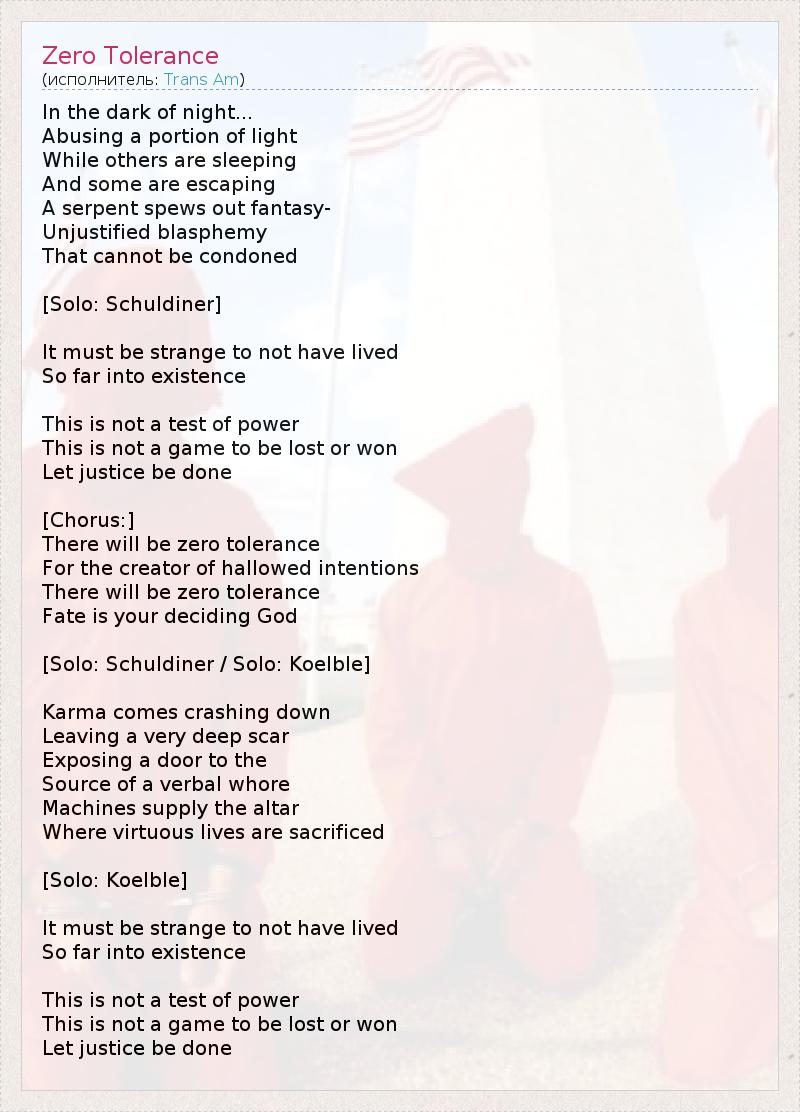 In the dark of night... Abusing a portion of light While others are sleeping And some are escaping A serpent spews out fantasy- Unjustified blasphemy That cannot be condoned [Solo: Schuldiner] It must be strange to not have lived So far into existence This is not a test of power This is not a game to be lost or won Let justice be done [Chorus:] There will be zero tolerance For the creator of hallowed intentions There will be zero tolerance Fate is your deciding God [Solo: Schuldiner / Solo: Koelble] Karma comes crashing down Leaving a very deep scar Exposing a door to the Source of a verbal whore Machines supply the altar Where virtuous lives are sacrificed [Solo: Koelble] It must be strange to not have lived So far into existence This is not a test of power This is not a game to be lost or won Let justice be done