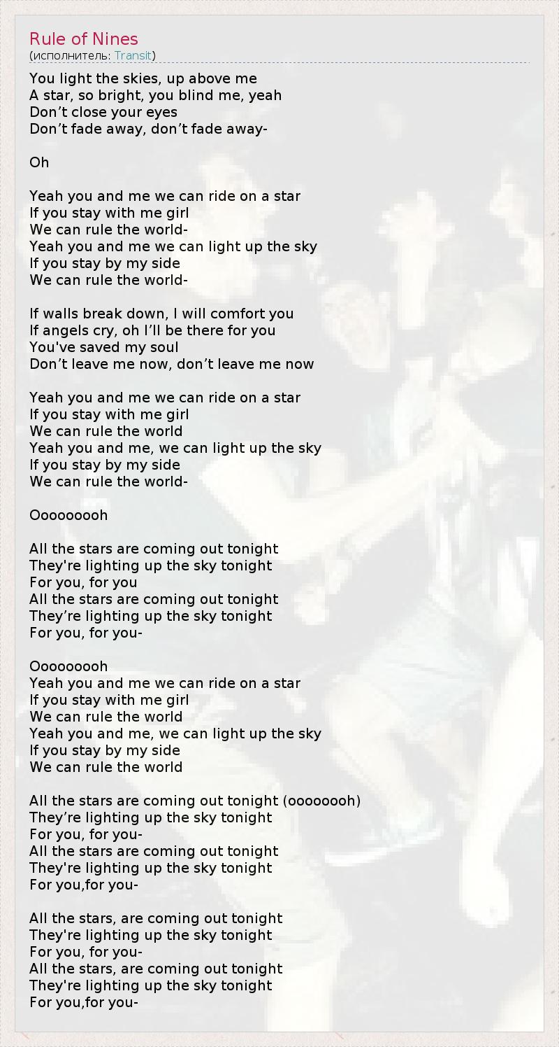 Ты освещаешь небо надо мной, Такая яркая звезда, ты меня слепишь (Еа) Не закрывай глаза, Не исчезай! Оу О, ты и я – мы можем покататься на звезде, Если ты будешь со мной – Мы сможем править миром. О, ты и я – мы можем зажечь небо, Если ты будешь рядом – Мы сможем править миром. Если упадут стены, я успокою тебя Если заплачут ангелы, О, я буду рядом, Ты спасла мою душу, Не покидай меня сейчас, не покидай сейчас. О, ты и я – мы можем покататься на звезде, Если ты будешь со мной – Мы сможем править миром. О, ты и я – мы можем зажечь небо, Если ты будешь рядом – Мы сможем править миром. Оооооу Все-все звезды выйдут на небо сегодня Они буду освещать небо Для тебя, для тебя Все-все звезды выйдут на небо сегодня Они буду освещать небо Для тебя, для тебя Оооооу О, ты и я – мы можем покататься на звезде, Если ты будешь со мной – Мы сможем править миром. О, ты и я – мы можем зажечь небо, Если ты будешь рядом – Мы сможем править миром. Все-все звезды выйдут на небо сегодня (ооу) Они буду освещать небо Для тебя, для тебя Все-все звезды выйдут на небо сегодня Они буду освещать небо Для тебя, для тебя Все-все звезды выйдут на небо сегодня Они буду освещать небо Для тебя, для тебя Все-все звезды выйдут на небо сегодня Они буду освещать небо Для тебя, для тебя