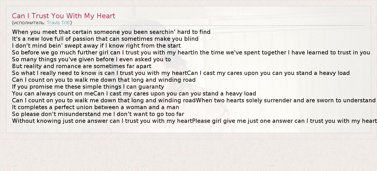 When you meet that certain someone you been searchin' hard to find It's a new love full of passion that can sometimes make you blind I don't mind bein' swept away if I know right from the start So before we go much further girl can I trust you with my heartIn the time we've spent together I have learned to trust in you So many things you've given before I even asked you to But reality and romance are sometimes far apart So what I really need to know is can I trust you with my heartCan I cast my cares upon you can you stand a heavy load Can I count on you to walk me down that long and winding road If you promise me these simple things I can guaranty You can always count on meCan I cast my cares upon you can you stand a heavy load Can I count on you to walk me down that long and winding roadWhen two hearts solely surrender and are sworn to understand It completes a perfect union between a woman and a man So please don't misunderstand me I don't want to go too far Without knowing just one answer can I trust you with my heartPlease girl give me just one answer can I trust you with my heart