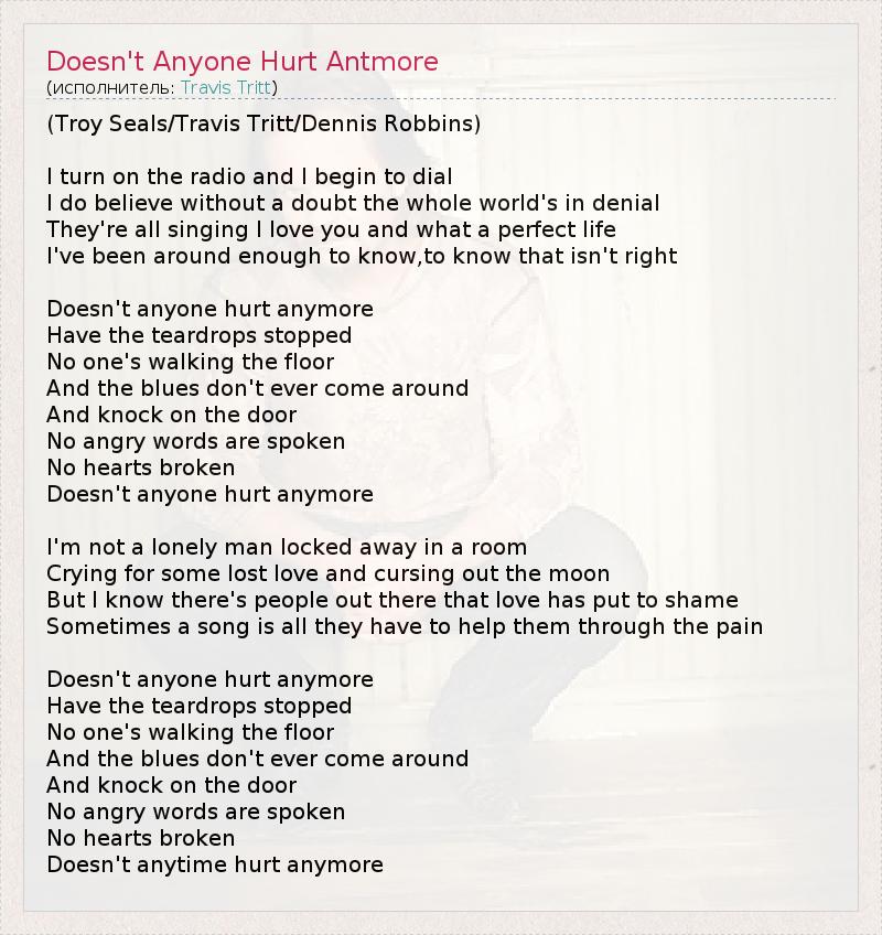(Troy Seals/Travis Tritt/Dennis Robbins) I turn on the radio and I begin to dial I do believe without a doubt the whole world's in denial They're all singing I love you and what a perfect life I've been around enough to know,to know that isn't right Doesn't anyone hurt anymore Have the teardrops stopped No one's walking the floor And the blues don't ever come around And knock on the door No angry words are spoken No hearts broken Doesn't anyone hurt anymore I'm not a lonely man locked away in a room Crying for some lost love and cursing out the moon But I know there's people out there that love has put to shame Sometimes a song is all they have to help them through the pain Doesn't anyone hurt anymore Have the teardrops stopped No one's walking the floor And the blues don't ever come around And knock on the door No angry words are spoken No hearts broken Doesn't anytime hurt anymore
