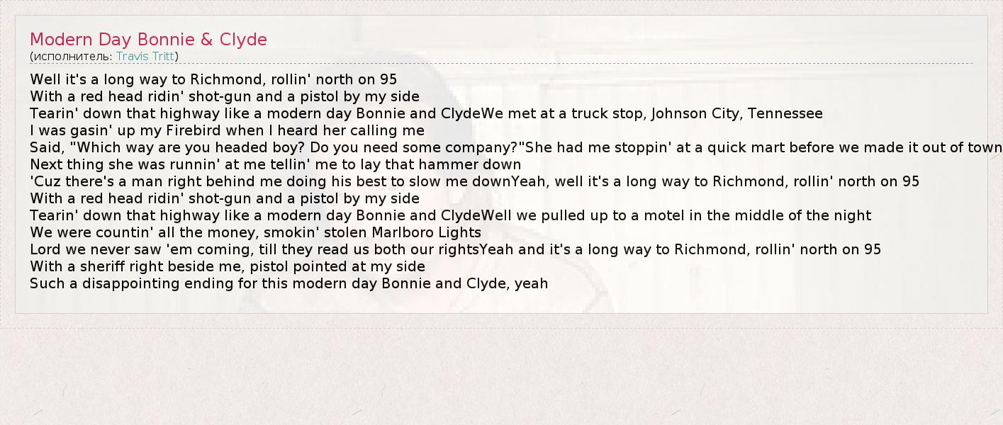А как ты думаешь, о чем песня "Modern Day Bonnie & Clyde" ?