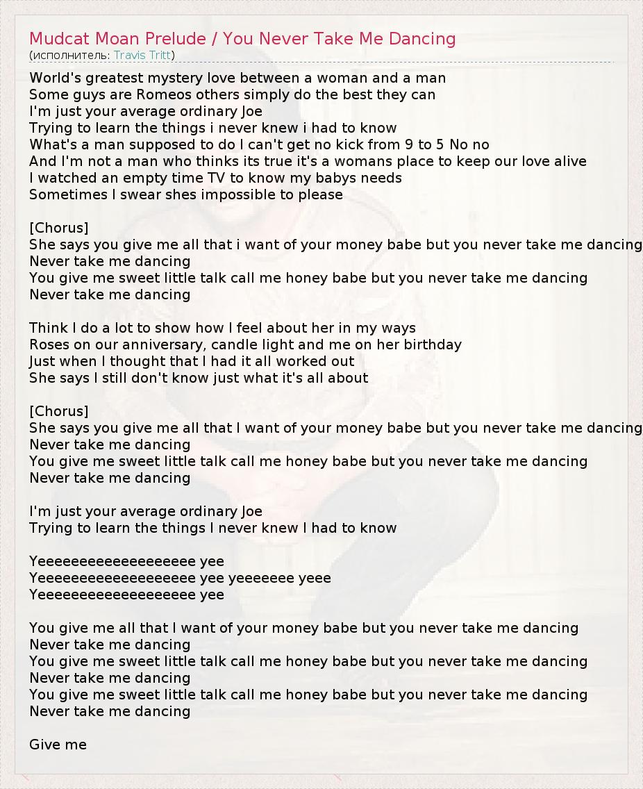 А как ты думаешь, о чем песня "Mudcat Moan Prelude / You Never Take Me Dancing" ?