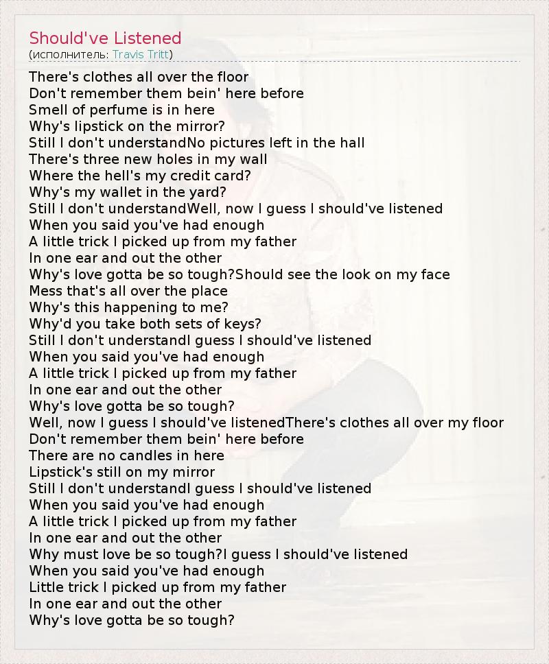 There's clothes all over the floor Don't remember them bein' here before Smell of perfume is in here Why's lipstick on the mirror? Still I don't understandNo pictures left in the hall There's three new holes in my wall Where the hell's my credit card? Why's my wallet in the yard? Still I don't understandWell, now I guess I should've listened When you said you've had enough A little trick I picked up from my father In one ear and out the other Why's love gotta be so tough?Should see the look on my face Mess that's all over the place Why's this happening to me? Why'd you take both sets of keys? Still I don't understandI guess I should've listened When you said you've had enough A little trick I picked up from my father In one ear and out the other Why's love gotta be so tough? Well, now I guess I should've listenedThere's clothes all over my floor Don't remember them bein' here before There are no candles in here Lipstick's still on my mirror Still I don't understandI guess I should've listened When you said you've had enough A little trick I picked up from my father In one ear and out the other Why must love be so tough?I guess I should've listened When you said you've had enough Little trick I picked up from my father In one ear and out the other Why's love gotta be so tough?