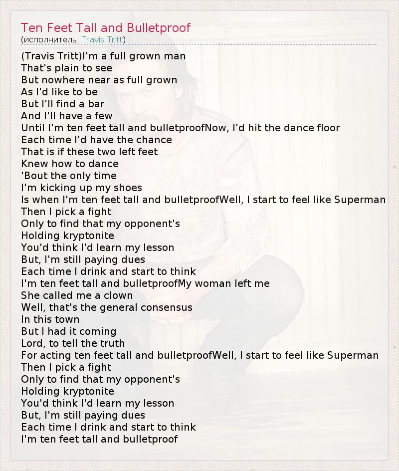 (Travis Tritt)I'm a full grown man That's plain to see But nowhere near as full grown As I'd like to be But I'll find a bar And I'll have a few Until I'm ten feet tall and bulletproofNow, I'd hit the dance floor Each time I'd have the chance That is if these two left feet Knew how to dance 'Bout the only time I'm kicking up my shoes Is when I'm ten feet tall and bulletproofWell, I start to feel like Superman Then I pick a fight Only to find that my opponent's Holding kryptonite You'd think I'd learn my lesson But, I'm still paying dues Each time I drink and start to think I'm ten feet tall and bulletproofMy woman left me She called me a clown Well, that's the general consensus In this town But I had it coming Lord, to tell the truth For acting ten feet tall and bulletproofWell, I start to feel like Superman Then I pick a fight Only to find that my opponent's Holding kryptonite You'd think I'd learn my lesson But, I'm still paying dues Each time I drink and start to think I'm ten feet tall and bulletproof