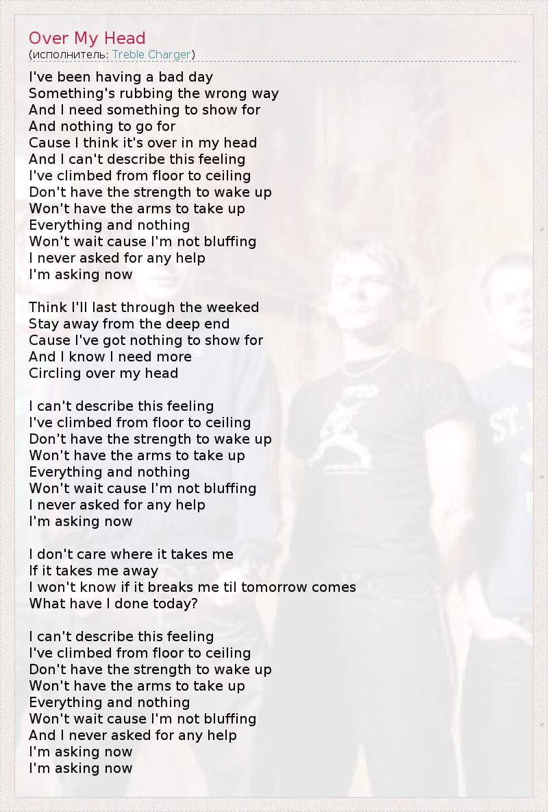 I've been having a bad day Something's rubbing the wrong way And I need something to show for And nothing to go for Cause I think it's over in my head And I can't describe this feeling I've climbed from floor to ceiling Don't have the strength to wake up Won't have the arms to take up Everything and nothing Won't wait cause I'm not bluffing I never asked for any help I'm asking now Think I'll last through the weeked Stay away from the deep end Cause I've got nothing to show for And I know I need more Circling over my head I can't describe this feeling I've climbed from floor to ceiling Don't have the strength to wake up Won't have the arms to take up Everything and nothing Won't wait cause I'm not bluffing I never asked for any help I'm asking now I don't care where it takes me If it takes me away I won't know if it breaks me til tomorrow comes What have I done today? I can't describe this feeling I've climbed from floor to ceiling Don't have the strength to wake up Won't have the arms to take up Everything and nothing Won't wait cause I'm not bluffing And I never asked for any help I'm asking now I'm asking now
