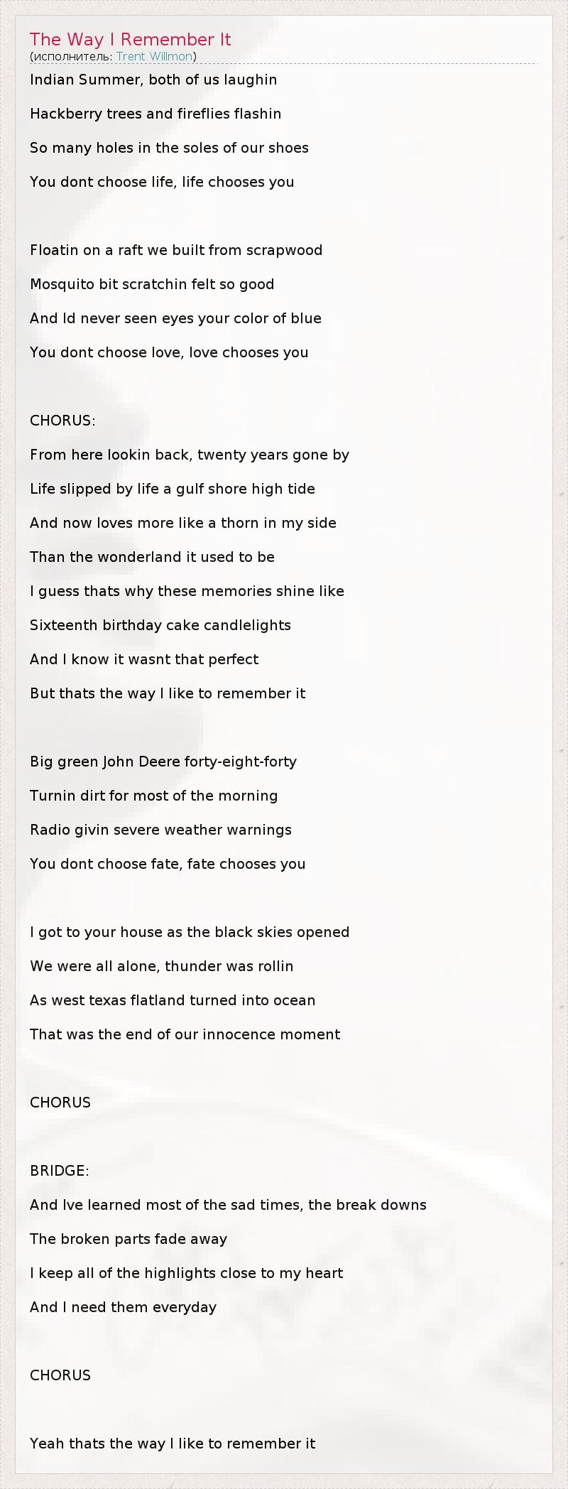 Indian Summer, both of us laughin Hackberry trees and fireflies flashin So many holes in the soles of our shoes You dont choose life, life chooses you Floatin on a raft we built from scrapwood Mosquito bit scratchin felt so good And Id never seen eyes your color of blue You dont choose love, love chooses you CHORUS: From here lookin back, twenty years gone by Life slipped by life a gulf shore high tide And now loves more like a thorn in my side Than the wonderland it used to be I guess thats why these memories shine like Sixteenth birthday cake candlelights And I know it wasnt that perfect But thats the way I like to remember it Big green John Deere forty-eight-forty Turnin dirt for most of the morning Radio givin severe weather warnings You dont choose fate, fate chooses you I got to your house as the black skies opened We were all alone, thunder was rollin As west texas flatland turned into ocean That was the end of our innocence moment CHORUS BRIDGE: And Ive learned most of the sad times, the break downs The broken parts fade away I keep all of the highlights close to my heart And I need them everyday CHORUS Yeah thats the way I like to remember it