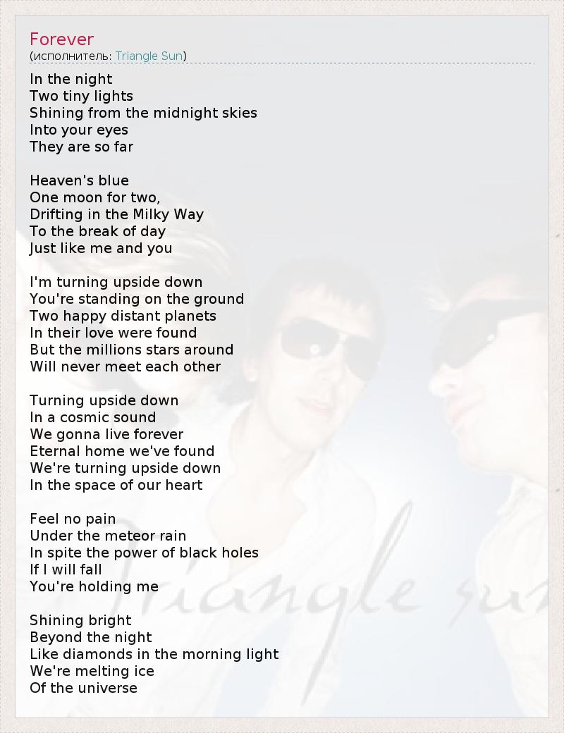 In the night Two tiny lights Shining from the midnight skies Into your eyes They are so far Heaven's blue One moon for two, Drifting in the Milky Way To the break of day Just like me and you I'm turning upside down You're standing on the ground Two happy distant planets In their love were found But the millions stars around Will never meet each other Turning upside down In a cosmic sound We gonna live forever Eternal home we've found We're turning upside down In the space of our heart Feel no pain Under the meteor rain In spite the power of black holes If I will fall You're holding me Shining bright Beyond the night Like diamonds in the morning light We're melting ice Of the universe