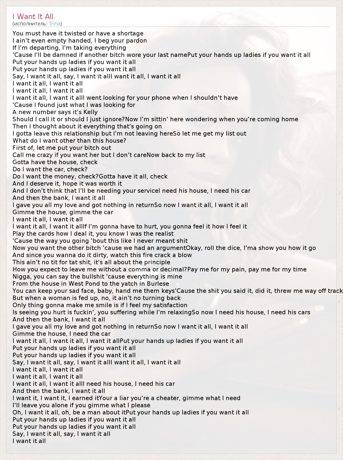 I want it all, I want it allIf I'm gonna have to hurt, you gonna feel it how I feel it