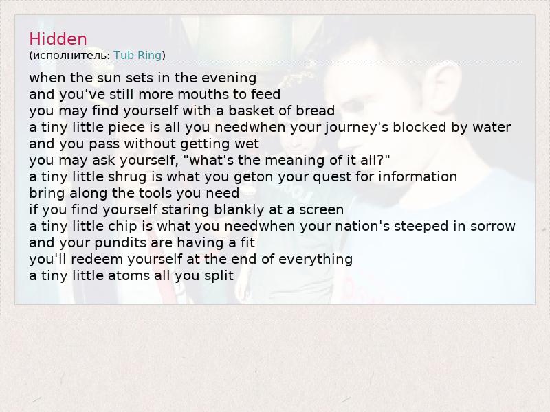 when the sun sets in the evening and you've still more mouths to feed you may find yourself with a basket of bread a tiny little piece is all you needwhen your journey's blocked by water and you pass without getting wet you may ask yourself, "what's the meaning of it all?" a tiny little shrug is what you geton your quest for information bring along the tools you need if you find yourself staring blankly at a screen a tiny little chip is what you needwhen your nation's steeped in sorrow and your pundits are having a fit you'll redeem yourself at the end of everything a tiny little atoms all you split