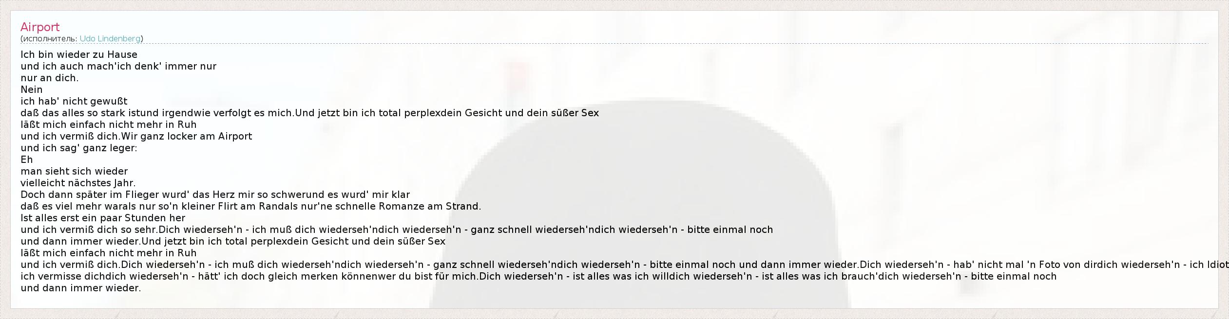 Ich bin wieder zu Hause und ich auch mach'ich denk' immer nur nur an dich. Nein ich hab' nicht gewußt daß das alles so stark istund irgendwie verfolgt es mich.Und jetzt bin ich total perplexdein Gesicht und dein süßer Sex läßt mich einfach nicht mehr in Ruh und ich vermiß dich.Wir ganz locker am Airport und ich sag' ganz leger: Eh man sieht sich wieder vielleicht nächstes Jahr. Doch dann später im Flieger wurd' das Herz mir so schwerund es wurd' mir klar daß es viel mehr warals nur so'n kleiner Flirt am Randals nur'ne schnelle Romanze am Strand. Ist alles erst ein paar Stunden her und ich vermiß dich so sehr.Dich wiederseh'n - ich muß dich wiederseh'ndich wiederseh'n - ganz schnell wiederseh'ndich wiederseh'n - bitte einmal noch und dann immer wieder.Und jetzt bin ich total perplexdein Gesicht und dein süßer Sex läßt mich einfach nicht mehr in Ruh und ich vermiß dich.Dich wiederseh'n - ich muß dich wiederseh'ndich wiederseh'n - ganz schnell wiederseh'ndich wiederseh'n - bitte einmal noch und dann immer wieder.Dich wiederseh'n - hab' nicht mal 'n Foto von dirdich wiederseh'n - ich Idiot ich vermisse dichdich wiederseh'n - hätt' ich doch gleich merken könnenwer du bist für mich.Dich wiederseh'n - ist alles was ich willdich wiederseh'n - ist alles was ich brauch'dich wiederseh'n - bitte einmal noch und dann immer wieder.