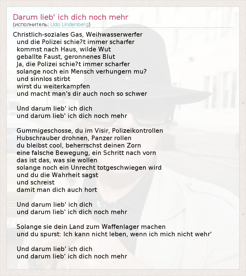 Christlich-soziales Gas, Weihwasserwerfer und die Polizei schie?t immer scharfer kommst nach Haus, wilde Wut geballte Faust, geronnenes Blut Ja, die Polizei schie?t immer scharfer solange noch ein Mensch verhungern mu? und sinnlos stirbt wirst du weiterkampfen und macht man's dir auch noch so schwer Und darum lieb' ich dich und darum lieb' ich dich noch mehr Gummigeschosse, du im Visir, Polizeikontrollen Hubschrauber drohnen, Panzer rollen du bleibst cool, beherrschst deinen Zorn eine falsche Bewegung, ein Schritt nach vorn das ist das, was sie wollen solange noch ein Unrecht totgeschwiegen wird und du die Wahrheit sagst und schreist damit man dich auch hort Und darum lieb' ich dich und darum lieb' ich dich noch mehr Solange sie dein Land zum Waffenlager machen und du spurst: Ich kann nicht leben, wenn ich mich nicht wehr' Und darum lieb' ich dich und darum lieb' ich dich noch mehr
