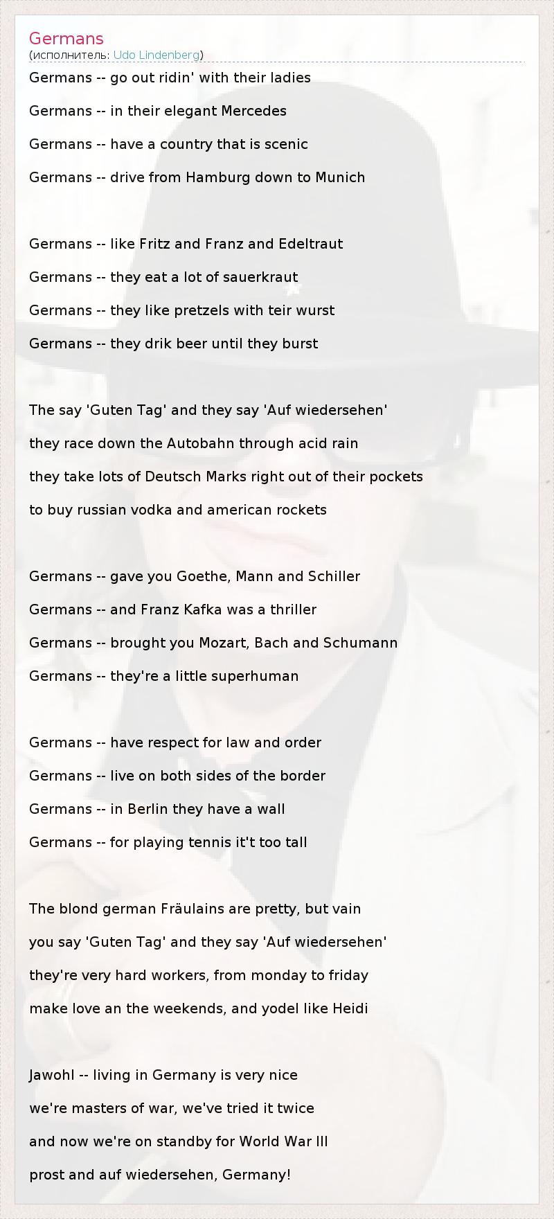 Germans -- go out ridin' with their ladies Germans -- in their elegant Mercedes Germans -- have a country that is scenic Germans -- drive from Hamburg down to Munich Germans -- like Fritz and Franz and Edeltraut Germans -- they eat a lot of sauerkraut Germans -- they like pretzels with teir wurst Germans -- they drik beer until they burst The say 'Guten Tag' and they say 'Auf wiedersehen' they race down the Autobahn through acid rain they take lots of Deutsch Marks right out of their pockets to buy russian vodka and american rockets Germans -- gave you Goethe, Mann and Schiller Germans -- and Franz Kafka was a thriller Germans -- brought you Mozart, Bach and Schumann Germans -- they're a little superhuman Germans -- have respect for law and order Germans -- live on both sides of the border Germans -- in Berlin they have a wall Germans -- for playing tennis it't too tall The blond german Fräulains are pretty, but vain you say 'Guten Tag' and they say 'Auf wiedersehen' they're very hard workers, from monday to friday make love an the weekends, and yodel like Heidi Jawohl -- living in Germany is very nice we're masters of war, we've tried it twice and now we're on standby for World War III prost and auf wiedersehen, Germany!