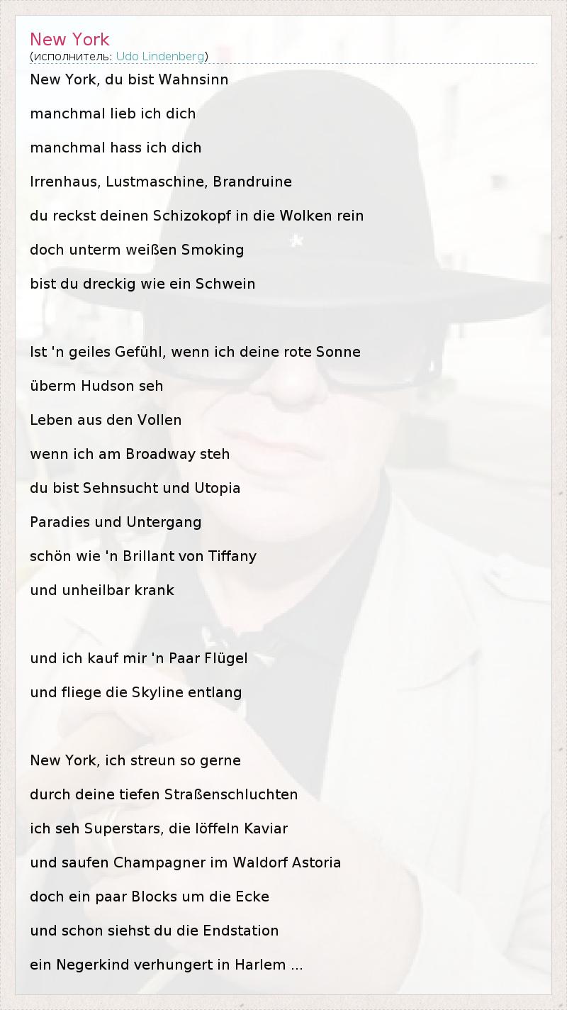 New York, du bist Wahnsinn manchmal lieb ich dich manchmal hass ich dich Irrenhaus, Lustmaschine, Brandruine du reckst deinen Schizokopf in die Wolken rein doch unterm weißen Smoking bist du dreckig wie ein Schwein Ist 'n geiles Gefühl, wenn ich deine rote Sonne überm Hudson seh Leben aus den Vollen wenn ich am Broadway steh du bist Sehnsucht und Utopia Paradies und Untergang schön wie 'n Brillant von Tiffany und unheilbar krank und ich kauf mir 'n Paar Flügel und fliege die Skyline entlang New York, ich streun so gerne durch deine tiefen Straßenschluchten ich seh Superstars, die löffeln Kaviar und saufen Champagner im Waldorf Astoria doch ein paar Blocks um die Ecke und schon siehst du die Endstation ein Negerkind verhungert in Harlem ...