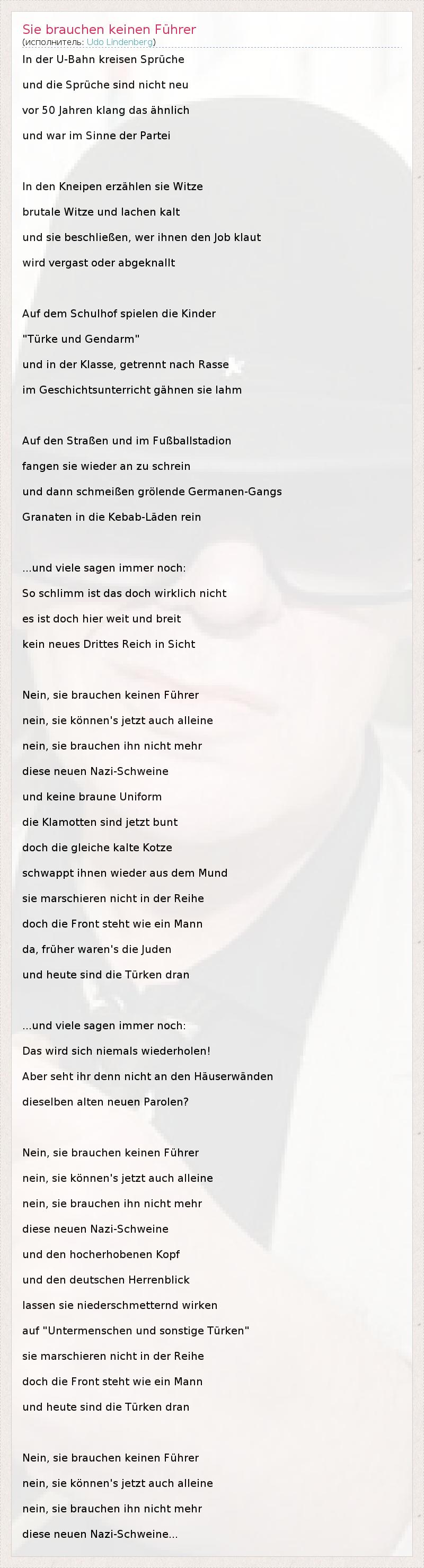 In der U-Bahn kreisen Sprüche und die Sprüche sind nicht neu vor 50 Jahren klang das ähnlich und war im Sinne der Partei In den Kneipen erzählen sie Witze brutale Witze und lachen kalt und sie beschließen, wer ihnen den Job klaut wird vergast oder abgeknallt Auf dem Schulhof spielen die Kinder "Türke und Gendarm" und in der Klasse, getrennt nach Rasse im Geschichtsunterricht gähnen sie lahm Auf den Straßen und im Fußballstadion fangen sie wieder an zu schrein und dann schmeißen grölende Germanen-Gangs Granaten in die Kebab-Läden rein ...und viele sagen immer noch: So schlimm ist das doch wirklich nicht es ist doch hier weit und breit kein neues Drittes Reich in Sicht Nein, sie brauchen keinen Führer nein, sie können's jetzt auch alleine nein, sie brauchen ihn nicht mehr diese neuen Nazi-Schweine und keine braune Uniform die Klamotten sind jetzt bunt doch die gleiche kalte Kotze schwappt ihnen wieder aus dem Mund sie marschieren nicht in der Reihe doch die Front steht wie ein Mann da, früher waren's die Juden und heute sind die Türken dran ...und viele sagen immer noch: Das wird sich niemals wiederholen! Aber seht ihr denn nicht an den Häuserwänden dieselben alten neuen Parolen? Nein, sie brauchen keinen Führer nein, sie können's jetzt auch alleine nein, sie brauchen ihn nicht mehr diese neuen Nazi-Schweine und den hocherhobenen Kopf und den deutschen Herrenblick lassen sie niederschmetternd wirken auf "Untermenschen und sonstige Türken" sie marschieren nicht in der Reihe doch die Front steht wie ein Mann und heute sind die Türken dran Nein, sie brauchen keinen Führer nein, sie können's jetzt auch alleine nein, sie brauchen ihn nicht mehr diese neuen Nazi-Schweine...