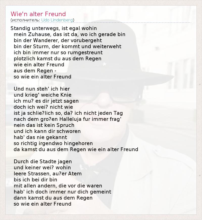 Standig unterwegs, ist egal wohin mein Zuhause, das ist da, wo ich gerade bin bin der Wanderer, der vorubergeht bin der Sturm, der kommt und weiterweht ich bin immer nur so rumgestreunt plotzlich kamst du aus dem Regen wie ein alter Freund aus dem Regen - so wie ein alter Freund Und nun steh' ich hier und krieg' weiche Knie ich mu? es dir jetzt sagen doch ich wei? nicht wie ist ja schlie?lich so, da? ich nicht jeden Tag nach dem gro?en Halleluja fur immer frag' nein das ist kein Spruch und ich kann dir schworen hab' das nie gekannt so richtig irgendwo hingehoren da kamst du aus dem Regen wie ein alter Freund Durch die Stadte jagen und keiner wei? wohin leere Strassen, au?er Atem bis ich bei dir bin mit allen andern, die vor die waren hab' ich doch immer nur dich gemeint dann kamst du aus dem Regen so wie ein alter Freund