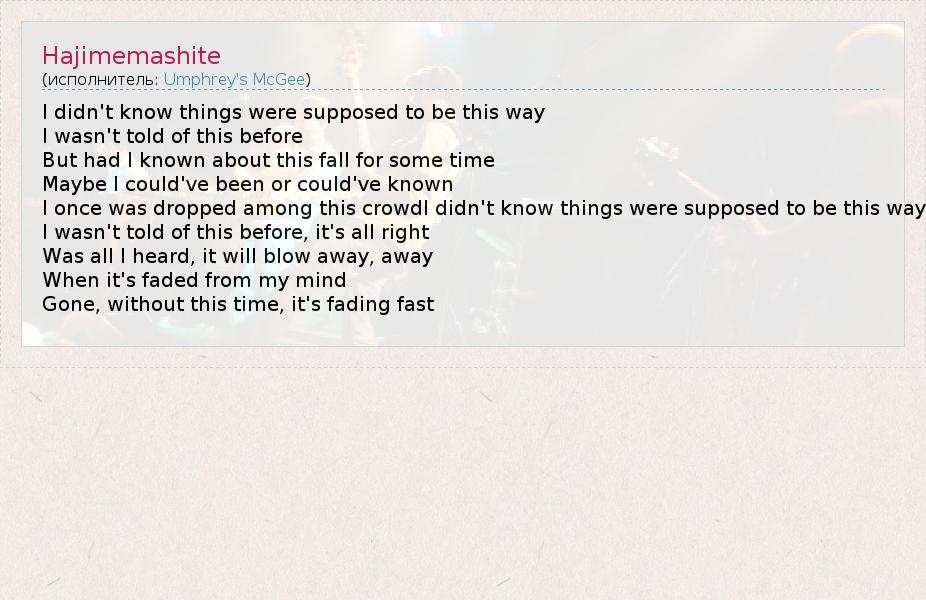 I didn't know things were supposed to be this way I wasn't told of this before But had I known about this fall for some time Maybe I could've been or could've known I once was dropped among this crowdI didn't know things were supposed to be this way I wasn't told of this before, it's all right Was all I heard, it will blow away, away When it's faded from my mind Gone, without this time, it's fading fast