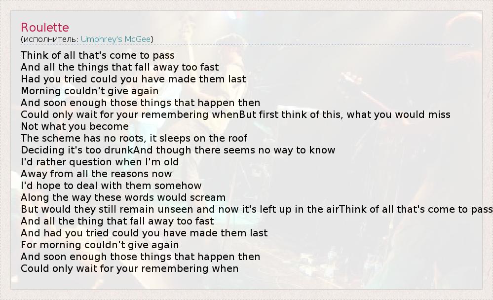 Это интересно:Umphrey's McGee is an American progressive rock band originally from South Bend, Indiana, whose music is often referred to as "progressive improvisation", or "improg". Although the band is part of the jam band scene, like Phish and the Grateful Dead (with ever-changing setlists, improvisation, two sets per night, open taping policy, etc.), they are much more influenced musically by progressive rock artists such as King Crimson, Yes, Pink Floyd, Frank Zappa, The Mahavishnu Orchestra, and early Genesis, as well as heavy metal bands such as Iron Maiden and Guns N' Roses. The band also identifies The Police, The Beatles, and Led Zeppelin as primary influences. UM experiments... продолжение