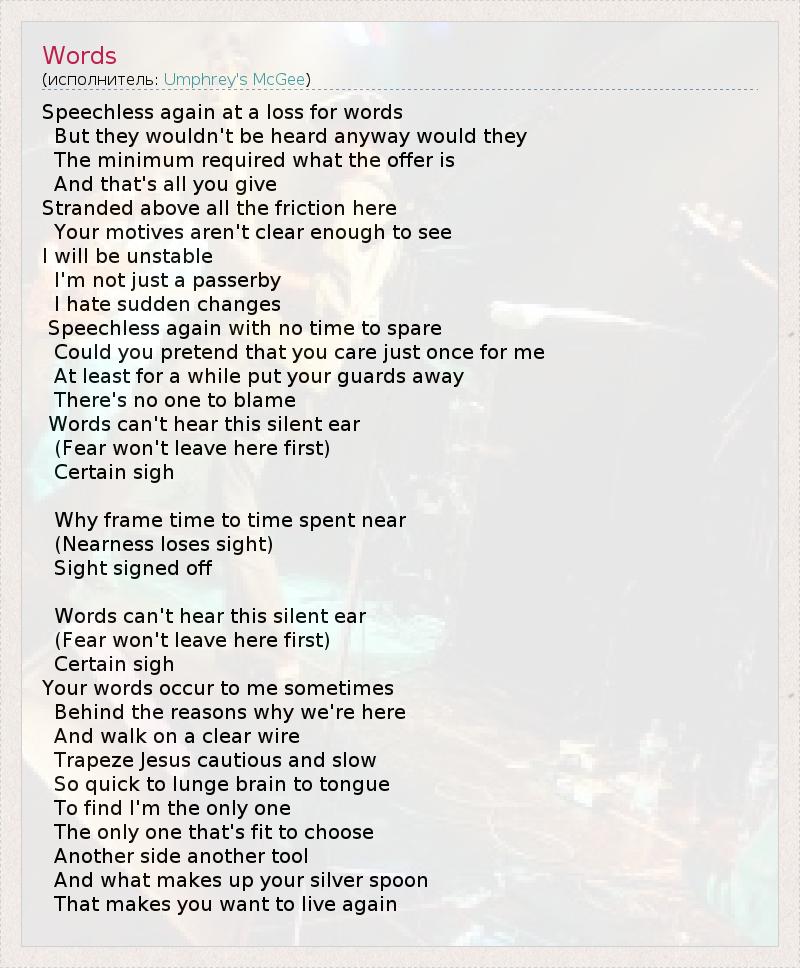 Speechless again at a loss for words But they wouldn't be heard anyway would they The minimum required what the offer is And that's all you give Stranded above all the friction here Your motives aren't clear enough to see I will be unstable I'm not just a passerby I hate sudden changes Speechless again with no time to spare Could you pretend that you care just once for me At least for a while put your guards away There's no one to blame Words can't hear this silent ear (Fear won't leave here first) Certain sigh Why frame time to time spent near (Nearness loses sight) Sight signed off Words can't hear this silent ear (Fear won't leave here first) Certain sigh Your words occur to me sometimes Behind the reasons why we're here And walk on a clear wire Trapeze Jesus cautious and slow So quick to lunge brain to tongue To find I'm the only one The only one that's fit to choose Another side another tool And what makes up your silver spoon That makes you want to live again