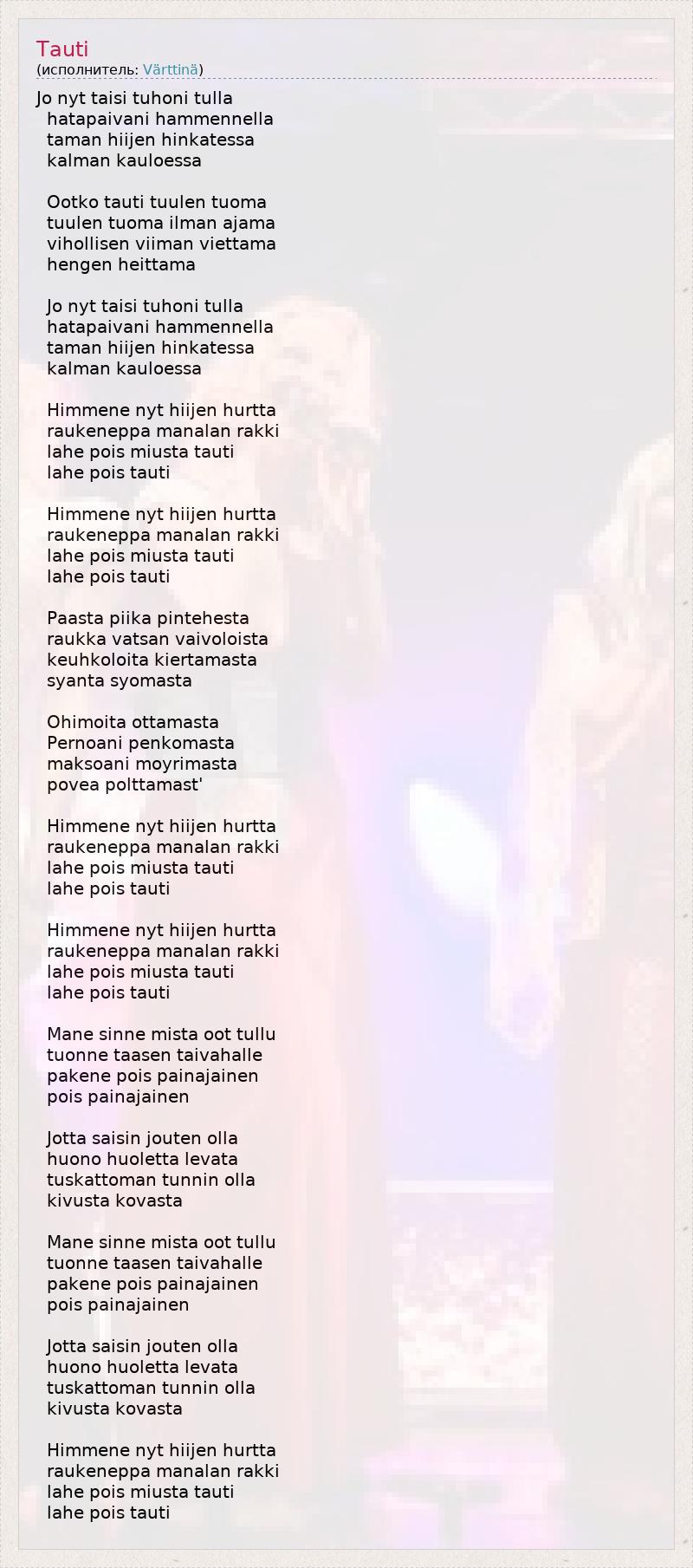 Это интересно:Värttinä, наиболее успешная современная фолк-группа Финляндии, известна благодаря факту изобретения вокально-инструментального стиля, основанного на национальных корнях, и не имеющего аналогов ни в Финляндии, ни вообще в мире. С лёгкостью смешивая древнюю финскую поэзию, характерные финно-угорские вокальные гармонии, традиционную и современную акустическую инструментовку, сложные и... продолжение