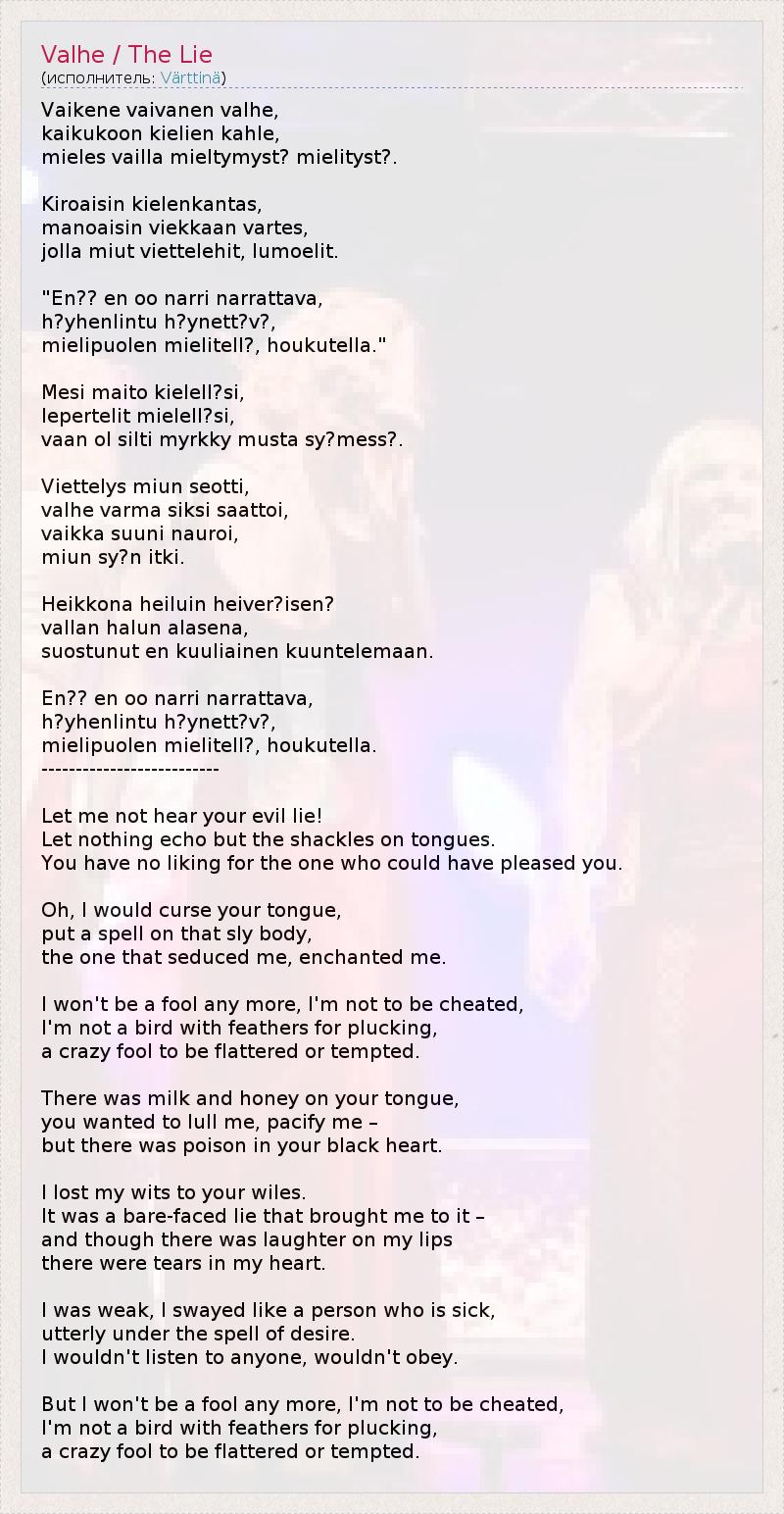 Vaikene vaivanen valhe, kaikukoon kielien kahle, mieles vailla mieltymyst? mielityst?. Kiroaisin kielenkantas, manoaisin viekkaan vartes, jolla miut viettelehit, lumoelit. "En?? en oo narri narrattava, h?yhenlintu h?ynett?v?, mielipuolen mielitell?, houkutella." Mesi maito kielell?si, lepertelit mielell?si, vaan ol silti myrkky musta sy?mess?. Viettelys miun seotti, valhe varma siksi saattoi, vaikka suuni nauroi, miun sy?n itki. Heikkona heiluin heiver?isen? vallan halun alasena, suostunut en kuuliainen kuuntelemaan. En?? en oo narri narrattava, h?yhenlintu h?ynett?v?, mielipuolen mielitell?, houkutella. -------------------------- Let me not hear your evil lie! Let nothing echo but the shackles on tongues. You have no liking for the one who could have pleased you. Oh, I would curse your tongue, put a spell on that sly body, the one that seduced me, enchanted me. I won't be a fool any more, I'm not to be cheated, I'm not a bird with feathers for plucking, a crazy fool to be flattered or tempted. There was milk and honey on your tongue, you wanted to lull me, pacify me – but there was poison in your black heart. I lost my wits to your wiles. It was a bare-faced lie that brought me to it – and though there was laughter on my lips there were tears in my heart. I was weak, I swayed like a person who is sick, utterly under the spell of desire. I wouldn't listen to anyone, wouldn't obey. But I won't be a fool any more, I'm not to be cheated, I'm not a bird with feathers for plucking, a crazy fool to be flattered or tempted.