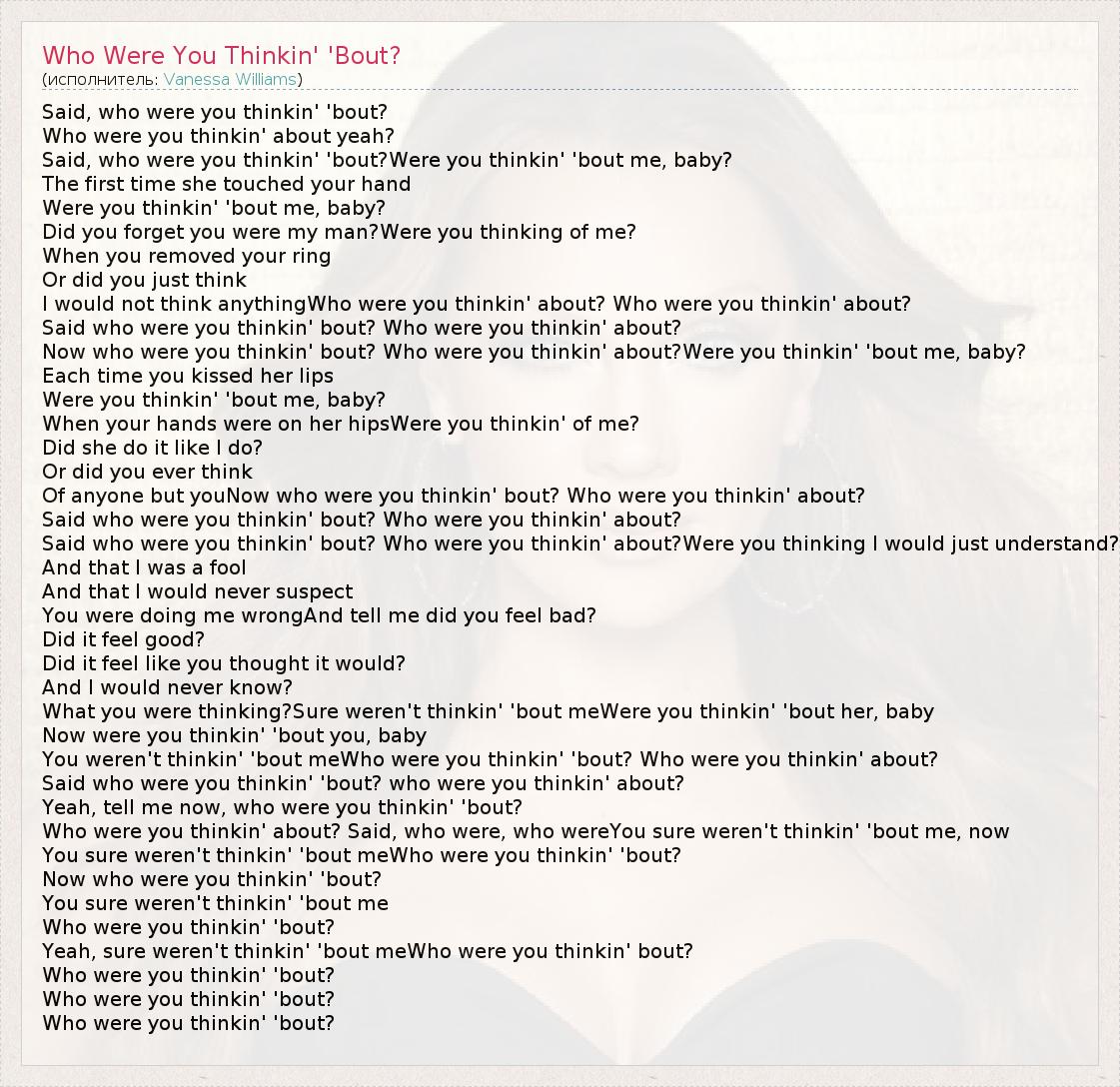 Said, who were you thinkin' 'bout? Who were you thinkin' about yeah? Said, who were you thinkin' 'bout?Were you thinkin' 'bout me, baby? The first time she touched your hand Were you thinkin' 'bout me, baby? Did you forget you were my man?Were you thinking of me? When you removed your ring Or did you just think I would not think anythingWho were you thinkin' about? Who were you thinkin' about? Said who were you thinkin' bout? Who were you thinkin' about? Now who were you thinkin' bout? Who were you thinkin' about?Were you thinkin' 'bout me, baby? Each time you kissed her lips Were you thinkin' 'bout me, baby? When your hands were on her hipsWere you thinkin' of me? Did she do it like I do? Or did you ever think Of anyone but youNow who were you thinkin' bout? Who were you thinkin' about? Said who were you thinkin' bout? Who were you thinkin' about? Said who were you thinkin' bout? Who were you thinkin' about?Were you thinking I would just understand? And that I was a fool And that I would never suspect You were doing me wrongAnd tell me did you feel bad? Did it feel good? Did it feel like you thought it would? And I would never know? What you were thinking?Sure weren't thinkin' 'bout meWere you thinkin' 'bout her, baby Now were you thinkin' 'bout you, baby You weren't thinkin' 'bout meWho were you thinkin' 'bout? Who were you thinkin' about? Said who were you thinkin' 'bout? who were you thinkin' about? Yeah, tell me now, who were you thinkin' 'bout? Who were you thinkin' about? Said, who were, who wereYou sure weren't thinkin' 'bout me, now You sure weren't thinkin' 'bout meWho were you thinkin' 'bout? Now who were you thinkin' 'bout? You sure weren't thinkin' 'bout me Who were you thinkin' 'bout? Yeah, sure weren't thinkin' 'bout meWho were you thinkin' bout? Who were you thinkin' 'bout? Who were you thinkin' 'bout? Who were you thinkin' 'bout?