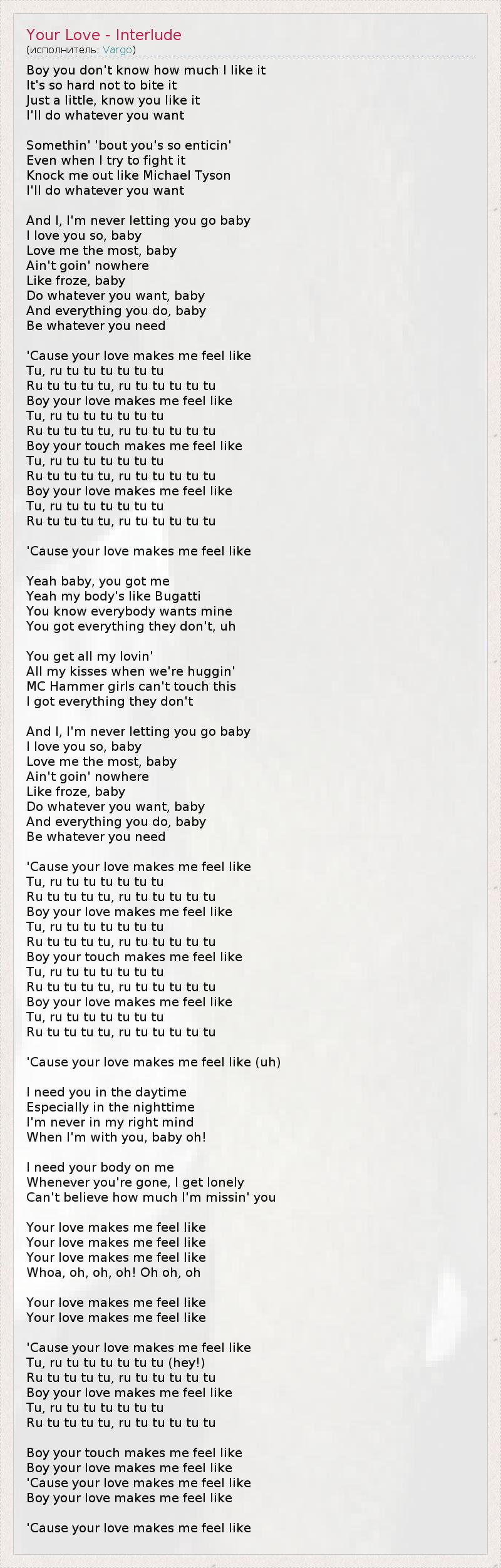 Boy you don't know how much I like it It's so hard not to bite it Just a little, know you like it I'll do whatever you want Somethin' 'bout you's so enticin' Even when I try to fight it Knock me out like Michael Tyson I'll do whatever you want And I, I'm never letting you go baby I love you so, baby Love me the most, baby Ain't goin' nowhere Like froze, baby Do whatever you want, baby And everything you do, baby Be whatever you need 'Cause your love makes me feel like Tu, ru tu tu tu tu tu tu Ru tu tu tu tu, ru tu tu tu tu tu Boy your love makes me feel like Tu, ru tu tu tu tu tu tu Ru tu tu tu tu, ru tu tu tu tu tu Boy your touch makes me feel like Tu, ru tu tu tu tu tu tu Ru tu tu tu tu, ru tu tu tu tu tu Boy your love makes me feel like Tu, ru tu tu tu tu tu tu Ru tu tu tu tu, ru tu tu tu tu tu 'Cause your love makes me feel like Yeah baby, you got me Yeah my body's like Bugatti You know everybody wants mine You got everything they don't, uh You get all my lovin' All my kisses when we're huggin' MC Hammer girls can't touch this I got everything they don't And I, I'm never letting you go baby I love you so, baby Love me the most, baby Ain't goin' nowhere Like froze, baby Do whatever you want, baby And everything you do, baby Be whatever you need 'Cause your love makes me feel like Tu, ru tu tu tu tu tu tu Ru tu tu tu tu, ru tu tu tu tu tu Boy your love makes me feel like Tu, ru tu tu tu tu tu tu Ru tu tu tu tu, ru tu tu tu tu tu Boy your touch makes me feel like Tu, ru tu tu tu tu tu tu Ru tu tu tu tu, ru tu tu tu tu tu Boy your love makes me feel like Tu, ru tu tu tu tu tu tu Ru tu tu tu tu, ru tu tu tu tu tu 'Cause your love makes me feel like (uh) I need you in the daytime Especially in the nighttime I'm never in my right mind When I'm with you, baby oh! I need your body on me Whenever you're gone, I get lonely Can't believe how much I'm missin' you Your love makes me feel like Your love makes me feel like Your love makes me feel like Whoa, oh, oh, oh! Oh oh, oh Your love makes me feel like Your love makes me feel like 'Cause your love makes me feel like Tu, ru tu tu tu tu tu tu (hey!) Ru tu tu tu tu, ru tu tu tu tu tu Boy your love makes me feel like Tu, ru tu tu tu tu tu tu Ru tu tu tu tu, ru tu tu tu tu tu Boy your touch makes me feel like Boy your love makes me feel like 'Cause your love makes me feel like Boy your love makes me feel like 'Cause your love makes me feel like