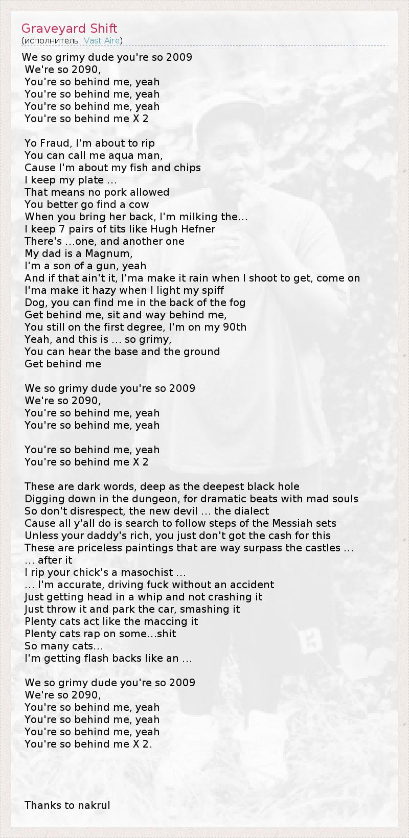 We so grimy dude you're so 2009 We're so 2090, You're so behind me, yeah You're so behind me, yeah You're so behind me, yeah You're so behind me X 2 Yo Fraud, I'm about to rip You can call me aqua man, Cause I'm about my fish and chips I keep my plate … That means no pork allowed You better go find a cow When you bring her back, I'm milking the… I keep 7 pairs of tits like Hugh Hefner There's …one, and another one My dad is a Magnum, I'm a son of a gun, yeah And if that ain't it, I'ma make it rain when I shoot to get, come on I'ma make it hazy when I light my spiff Dog, you can find me in the back of the fog Get behind me, sit and way behind me, You still on the first degree, I'm on my 90th Yeah, and this is … so grimy, You can hear the base and the ground Get behind me We so grimy dude you're so 2009 We're so 2090, You're so behind me, yeah You're so behind me, yeah You're so behind me, yeah You're so behind me X 2 These are dark words, deep as the deepest black hole Digging down in the dungeon, for dramatic beats with mad souls So don't disrespect, the new devil … the dialect Cause all y'all do is search to follow steps of the Messiah sets Unless your daddy's rich, you just don't got the cash for this These are priceless paintings that are way surpass the castles … … after it I rip your chick's a masochist … … I'm accurate, driving fuck without an accident Just getting head in a whip and not crashing it Just throw it and park the car, smashing it Plenty cats act like the maccing it Plenty cats rap on some…shit So many cats… I'm getting flash backs like an … We so grimy dude you're so 2009 We're so 2090, You're so behind me, yeah You're so behind me, yeah You're so behind me, yeah You're so behind me X 2. Thanks to nakrul