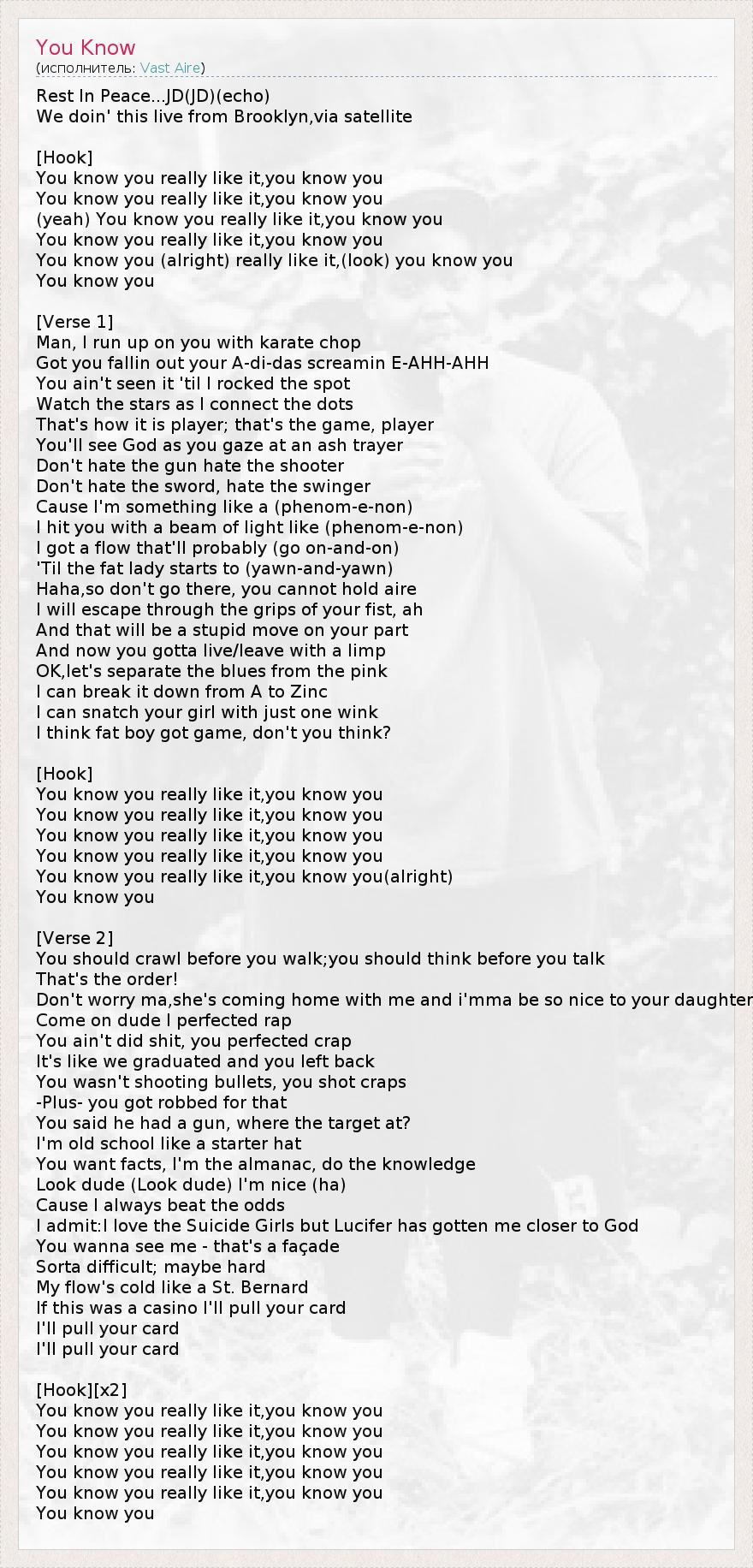 Rest In Peace...JD(JD)(echo) We doin' this live from Brooklyn,via satellite [Hook] You know you really like it,you know you You know you really like it,you know you (yeah) You know you really like it,you know you You know you really like it,you know you You know you (alright) really like it,(look) you know you You know you [Verse 1] Man, I run up on you with karate chop Got you fallin out your A-di-das screamin E-AHH-AHH You ain't seen it 'til I rocked the spot Watch the stars as I connect the dots That's how it is player; that's the game, player You'll see God as you gaze at an ash trayer Don't hate the gun hate the shooter Don't hate the sword, hate the swinger Cause I'm something like a (phenom-e-non) I hit you with a beam of light like (phenom-e-non) I got a flow that'll probably (go on-and-on) 'Til the fat lady starts to (yawn-and-yawn) Haha,so don't go there, you cannot hold aire I will escape through the grips of your fist, ah And that will be a stupid move on your part And now you gotta live/leave with a limp OK,let's separate the blues from the pink I can break it down from A to Zinc I can snatch your girl with just one wink I think fat boy got game, don't you think? [Hook] You know you really like it,you know you You know you really like it,you know you You know you really like it,you know you You know you really like it,you know you You know you really like it,you know you(alright) You know you [Verse 2] You should crawl before you walk;you should think before you talk That's the order! Don't worry ma,she's coming home with me and i'mma be so nice to your daughter Come on dude I perfected rap You ain't did shit, you perfected crap It's like we graduated and you left back You wasn't shooting bullets, you shot craps -Plus- you got robbed for that You said he had a gun, where the target at? I'm old school like a starter hat You want facts, I'm the almanac, do the knowledge Look dude (Look dude) I'm nice (ha) Cause I always beat the odds I admit:I love the Suicide Girls but Lucifer has gotten me closer to God You wanna see me - that's a façade Sorta difficult; maybe hard My flow's cold like a St. Bernard If this was a casino I'll pull your card I'll pull your card I'll pull your card [Hook][x2] You know you really like it,you know you You know you really like it,you know you You know you really like it,you know you You know you really like it,you know you You know you really like it,you know you You know you