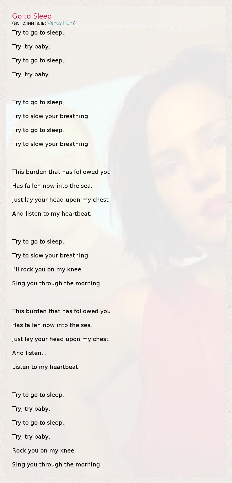 Try to go to sleep, Try, try baby. Try to go to sleep, Try, try baby. Try to go to sleep, Try to slow your breathing. Try to go to sleep, Try to slow your breathing. This burden that has followed you Has fallen now into the sea. Just lay your head upon my chest And listen to my heartbeat. Try to go to sleep, Try to slow your breathing. I'll rock you on my knee, Sing you through the morning. This burden that has followed you Has fallen now into the sea. Just lay your head upon my chest And listen... Listen to my heartbeat. Try to go to sleep, Try, try baby. Try to go to sleep, Try, try baby. Rock you on my knee, Sing you through the morning.