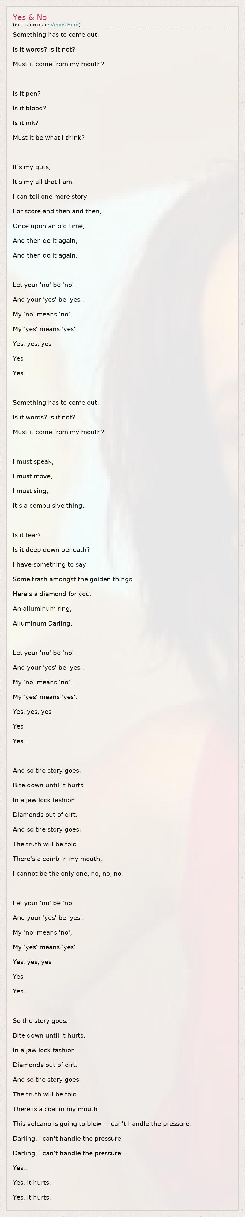 Something has to come out. Is it words? Is it not? Must it come from my mouth? Is it pen? Is it blood? Is it ink? Must it be what I think? It's my guts, It's my all that I am. I can tell one more story For score and then and then, Once upon an old time, And then do it again, And then do it again. Let your 'no' be 'no' And your 'yes' be 'yes'. My 'no' means 'no', My 'yes' means 'yes'. Yes, yes, yes Yes Yes... Something has to come out. Is it words? Is it not? Must it come from my mouth? I must speak, I must move, I must sing, It's a compulsive thing. Is it fear? Is it deep down beneath? I have something to say Some trash amongst the golden things. Here's a diamond for you. An alluminum ring, Alluminum Darling. Let your 'no' be 'no' And your 'yes' be 'yes'. My 'no' means 'no', My 'yes' means 'yes'. Yes, yes, yes Yes Yes... And so the story goes. Bite down until it hurts. In a jaw lock fashion Diamonds out of dirt. And so the story goes. The truth will be told There's a comb in my mouth, I cannot be the only one, no, no, no. Let your 'no' be 'no' And your 'yes' be 'yes'. My 'no' means 'no', My 'yes' means 'yes'. Yes, yes, yes Yes Yes... So the story goes. Bite down until it hurts. In a jaw lock fashion Diamonds out of dirt. And so the story goes - The truth will be told. There is a coal in my mouth This volcano is going to blow - I can't handle the pressure. Darling, I can't handle the pressure. Darling, I can't handle the pressure... Yes... Yes, it hurts. Yes, it hurts.