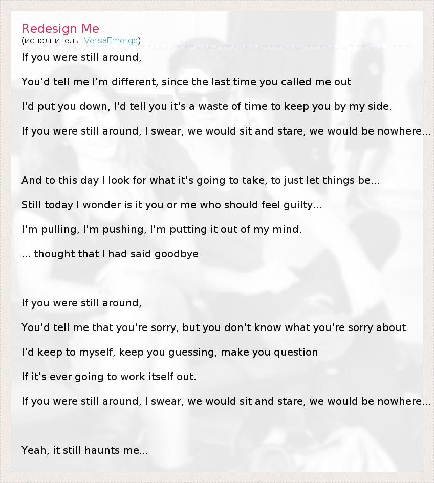 If you were still around, You'd tell me I'm different, since the last time you called me out I'd put you down, I'd tell you it's a waste of time to keep you by my side. If you were still around, I swear, we would sit and stare, we would be nowhere... And to this day I look for what it's going to take, to just let things be... Still today I wonder is it you or me who should feel guilty... I'm pulling, I'm pushing, I'm putting it out of my mind. ... thought that I had said goodbye If you were still around, You'd tell me that you're sorry, but you don't know what you're sorry about I'd keep to myself, keep you guessing, make you question If it's ever going to work itself out. If you were still around, I swear, we would sit and stare, we would be nowhere... Yeah, it still haunts me...